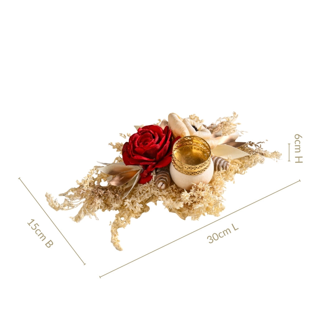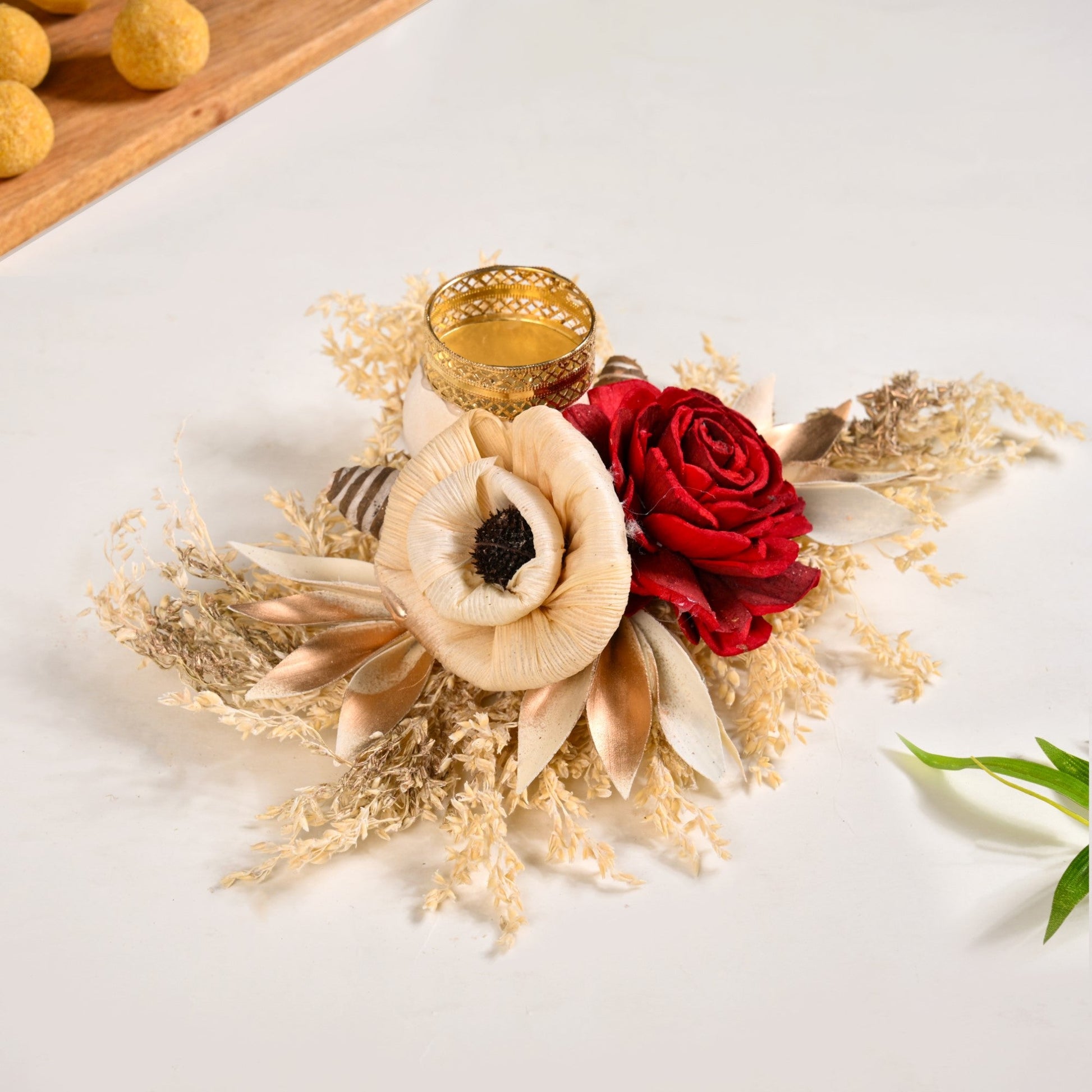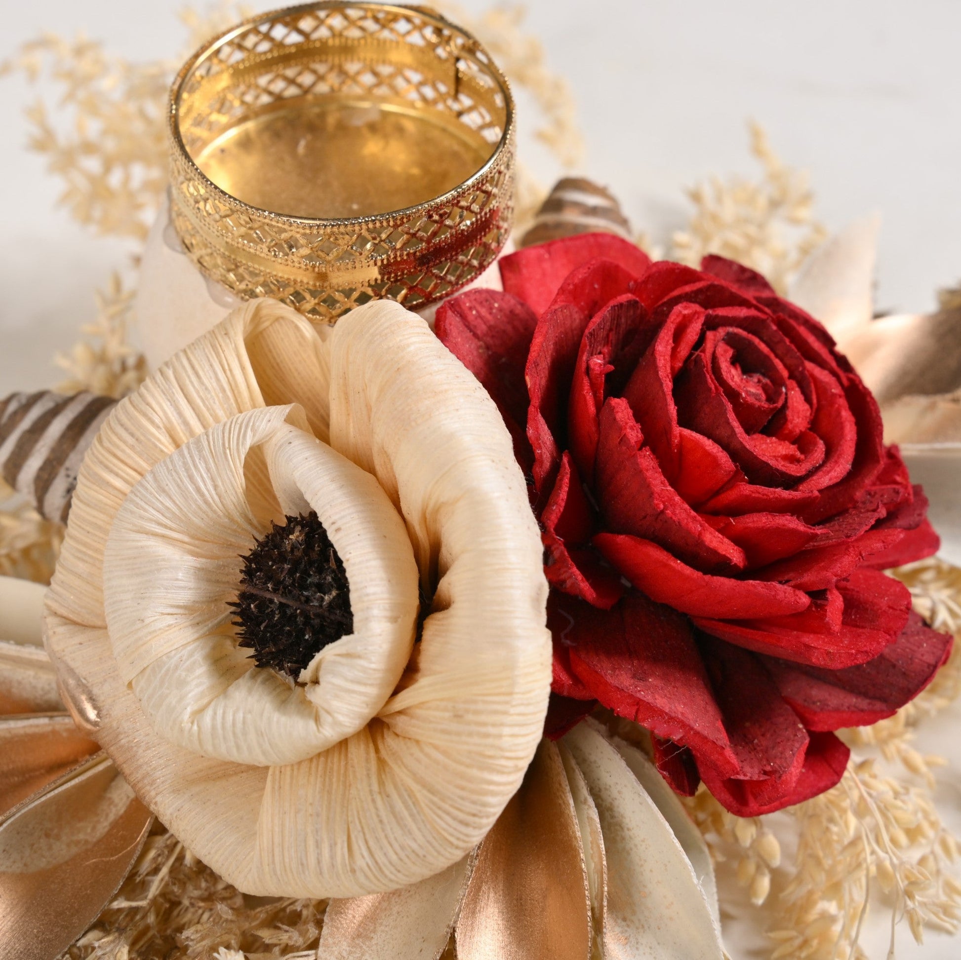 Design: The design showcases a vibrant, deep red sola pith and corn husk flower. Complementing it is a delicate, creamy off-white corn husk flower, adding a soft contrast. The flowers are artfully arranged amidst a lush base of naturally dried grasses and leaves, which create a rustic yet elegant foundation. Subtle golden-hued dried leaves are interspersed throughout, adding a touch of understated shimmer. Small, charming dried seed pods or similar natural embellishments further enhance the organic appeal. Nestled within this botanical arrangement is a small, intricately designed gold-colored sheet metal tealight holder, featuring delicate cutwork.