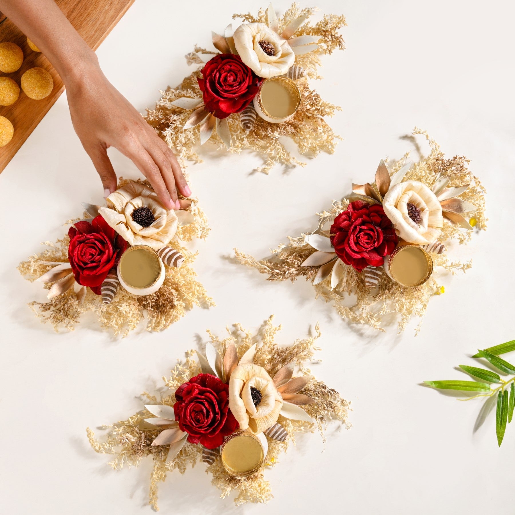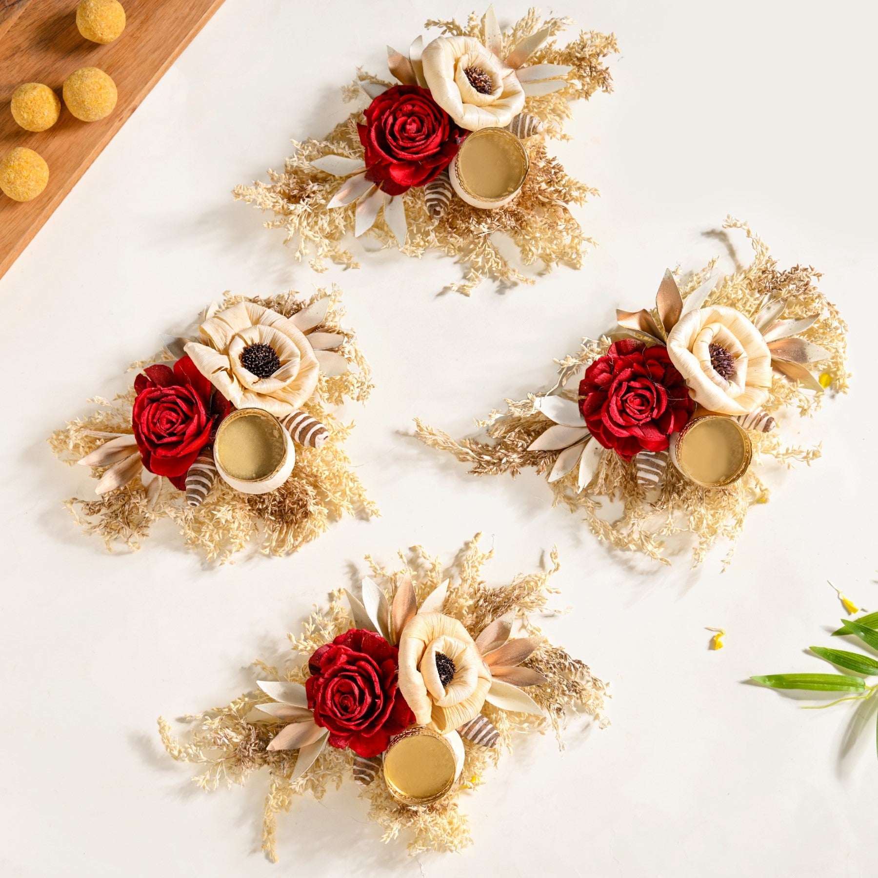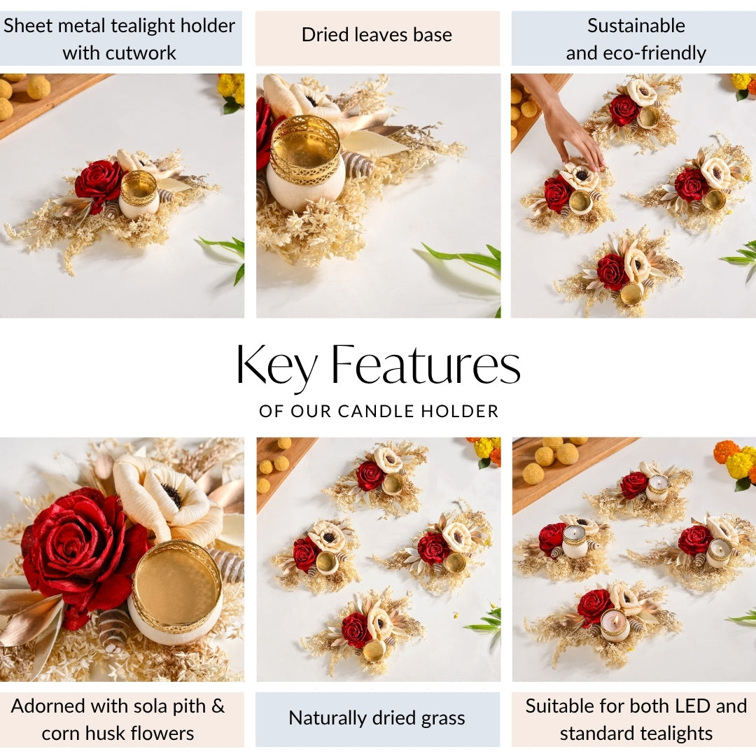 Design: The design showcases a vibrant, deep red sola pith and corn husk flower. Complementing it is a delicate, creamy off-white corn husk flower, adding a soft contrast. The flowers are artfully arranged amidst a lush base of naturally dried grasses and leaves, which create a rustic yet elegant foundation. Subtle golden-hued dried leaves are interspersed throughout, adding a touch of understated shimmer. Small, charming dried seed pods or similar natural embellishments further enhance the organic appeal. Nestled within this botanical arrangement is a small, intricately designed gold-colored sheet metal tealight holder, featuring delicate cutwork.