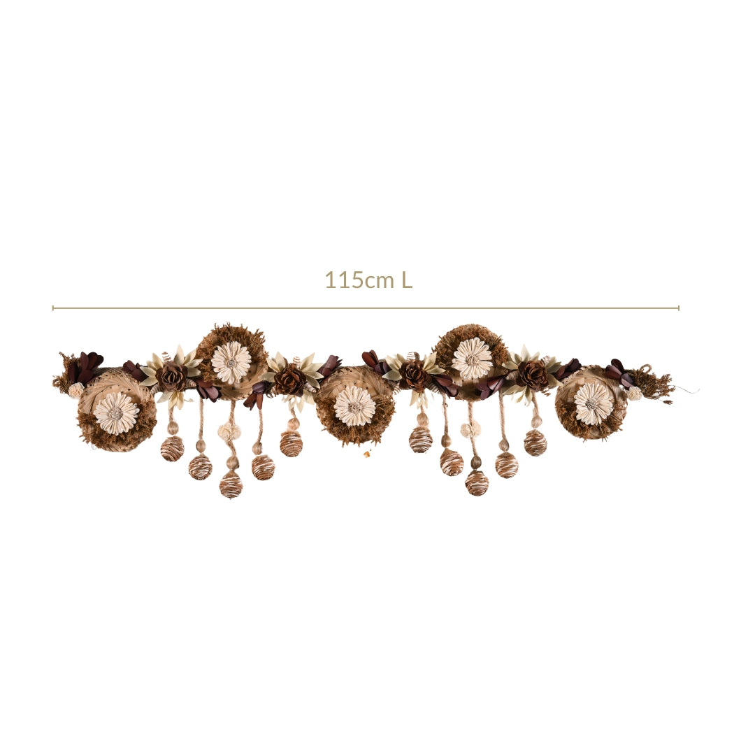 Design: This handcrafted bandarwal unveils a captivating design, featuring a prominent central cluster of intricately arranged sola flowers. These blooms are a delightful mix of creamy white and deep maroon hues, creating a beautiful contrast against the natural jute base. Each segment showcases smaller, detailed sola flower arrangements along with dried leaves, offering a textural beauty and a refreshing burst of colour. The piece culminates in elegantly braided jute tassels adorned with subtle floral details at both ends. It has multiple jute knots throughout the edges of the bandarwal for easy hanging.