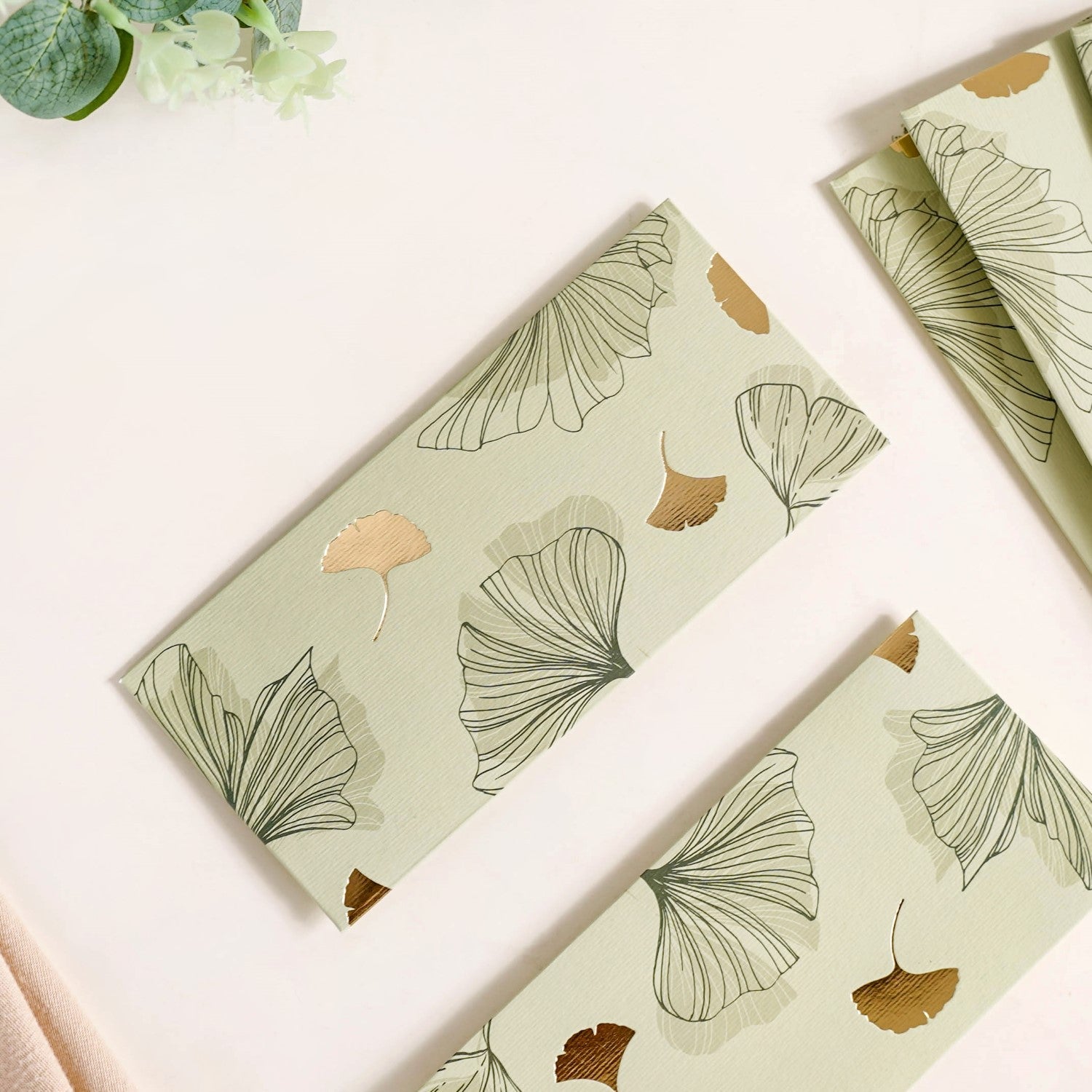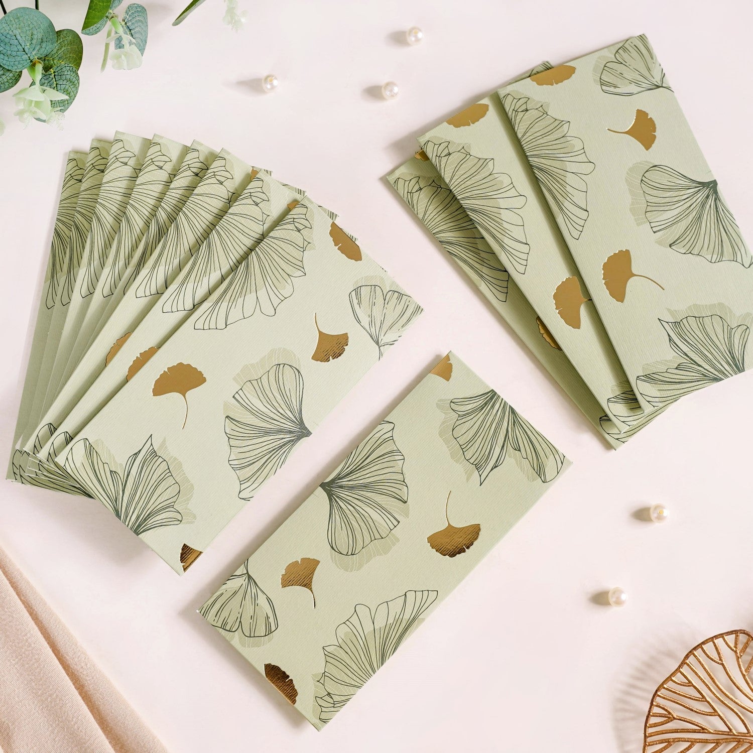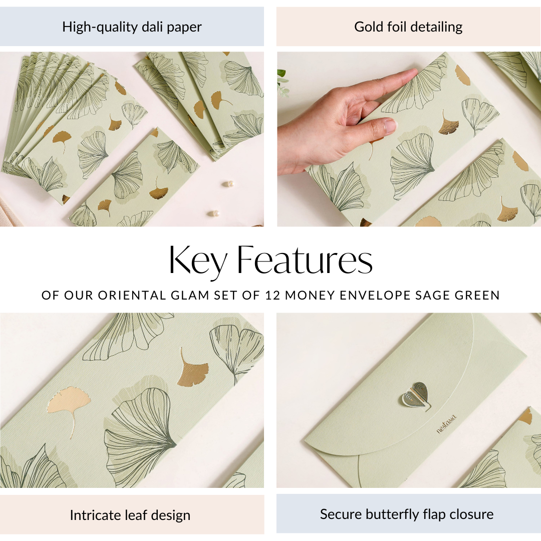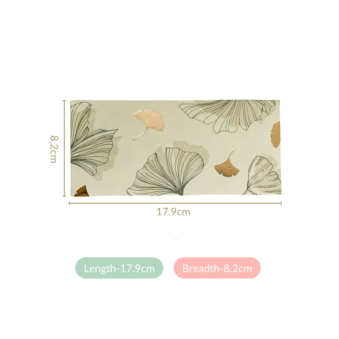 Add a touch of elegance to your gifting moments with our shagun envelopes, perfect for presenting money gifts during festivals and special occasions. Featuring an elegant ginkgo leaf motif and gold foil accents on a soft, sage backdrop, each envelope combines style and sophistication. Crafted from premium dali paper, these money envelopes not only offer a luxurious feel but are also extremely durable and eco-friendly, adding an extra layer of thoughtfulness to your gesture. So, whether you're gifting newlyweds, your favourite niece or nephew, or shagun during festive and special occasions, these gifting envelopes are a must-have.