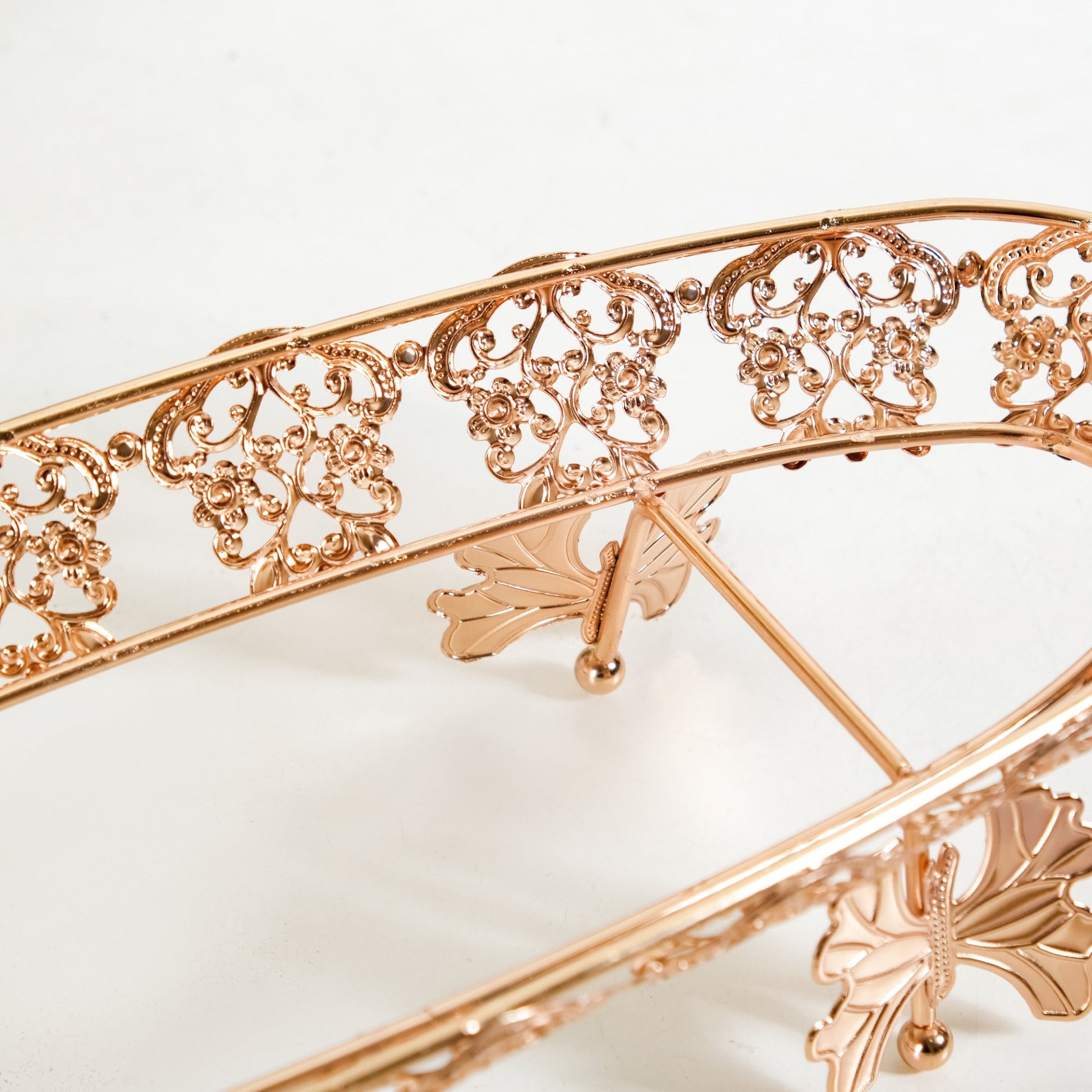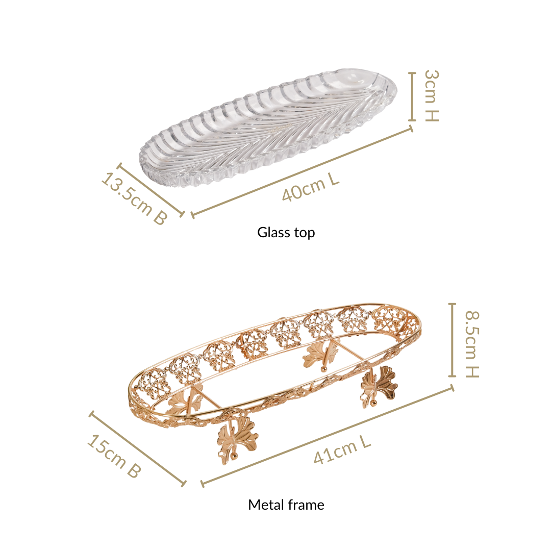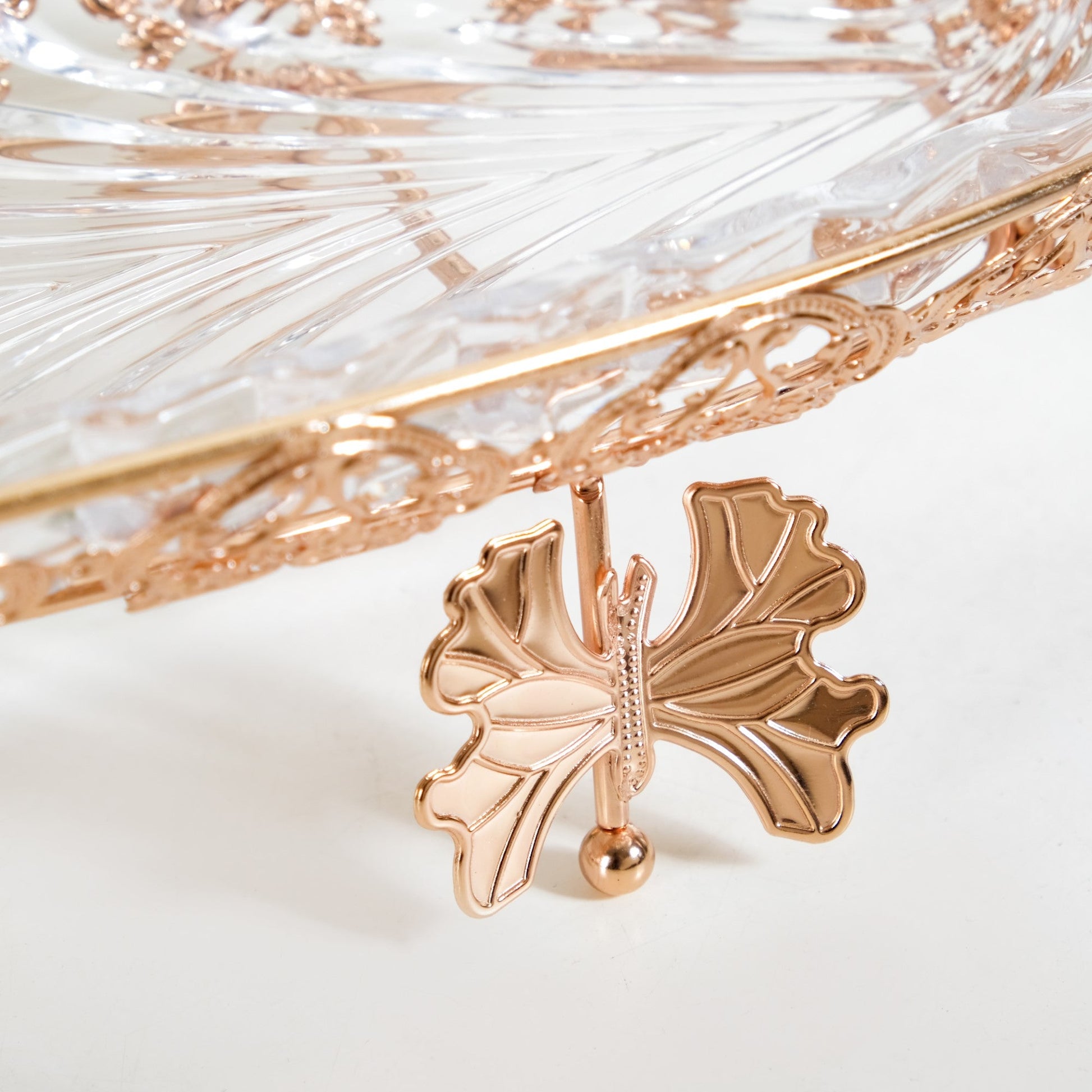 Design: The tray features ornate, vintage metalwork on the sturdy iron frame, highlighted by a high-sheen rose gold finish. Its butterfly-shaped iron stands offer both stability and charm, while the textured glass top adds a delicate touch to the overall look.