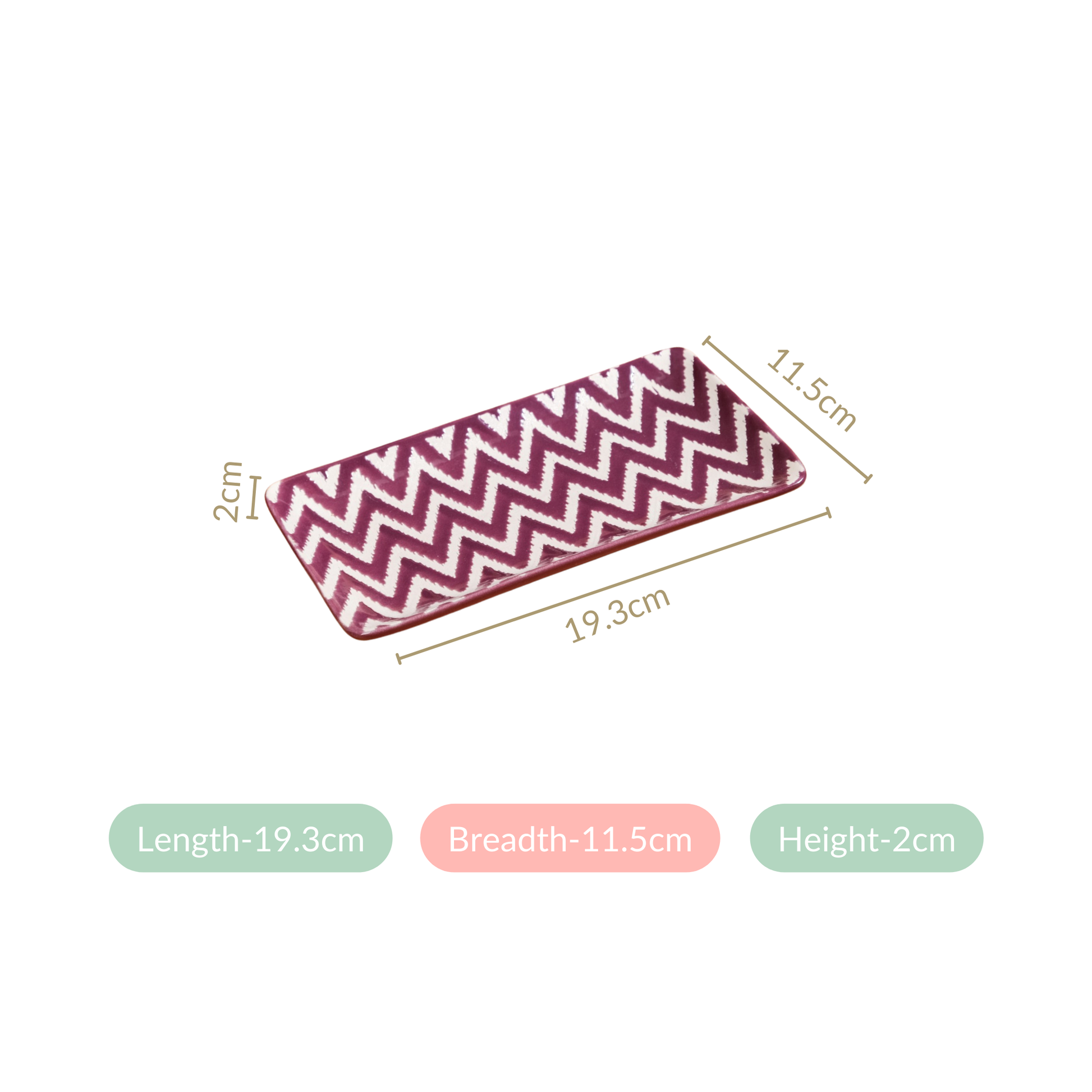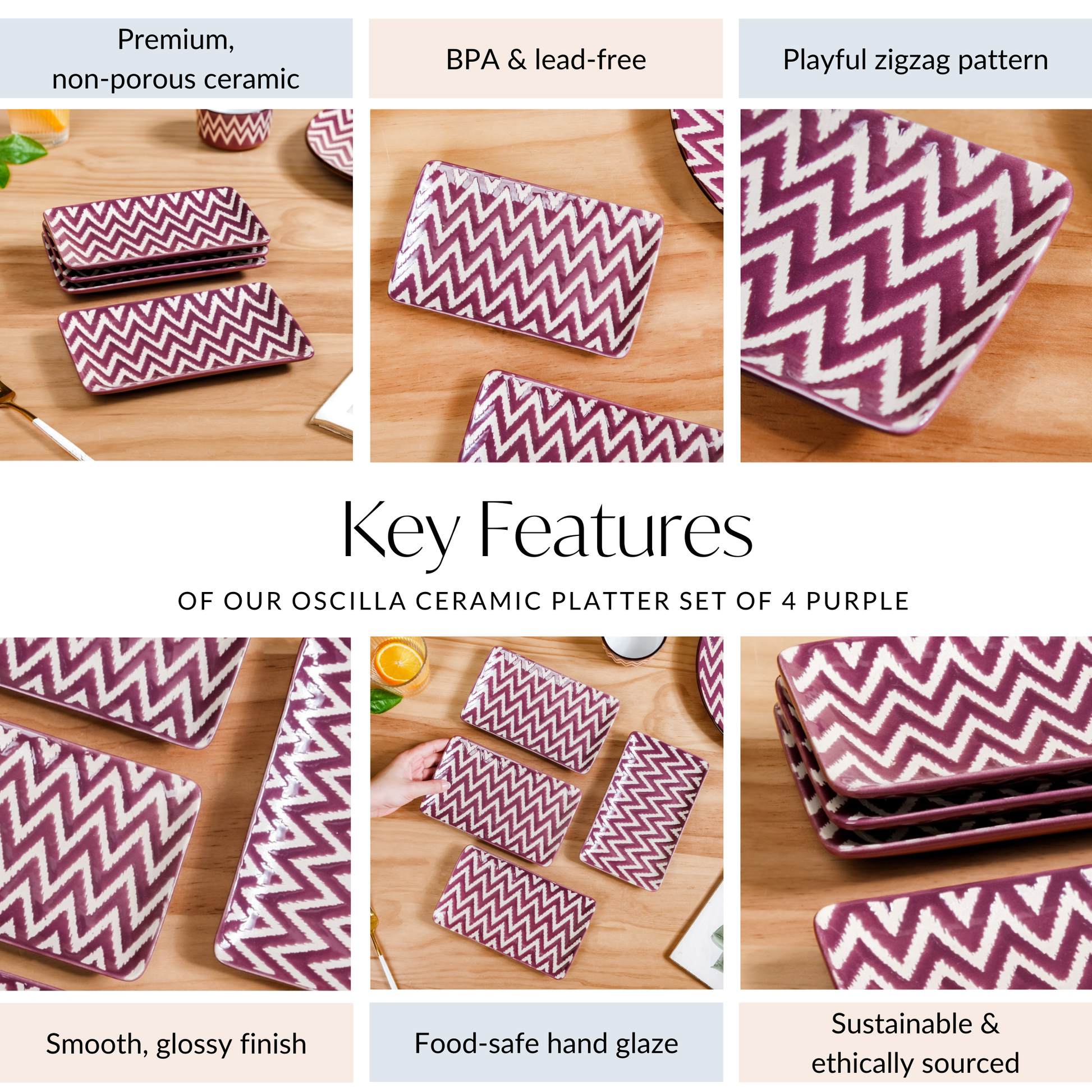 Design: This ceramic platter set features a vibrant zigzag design combining a bold purple hue and chic white, creating a dynamically delightful aesthetic. The platter's rectangular shape ensures they’re stylish and practical, giving you ample space to serve your favourite dishes with flair.