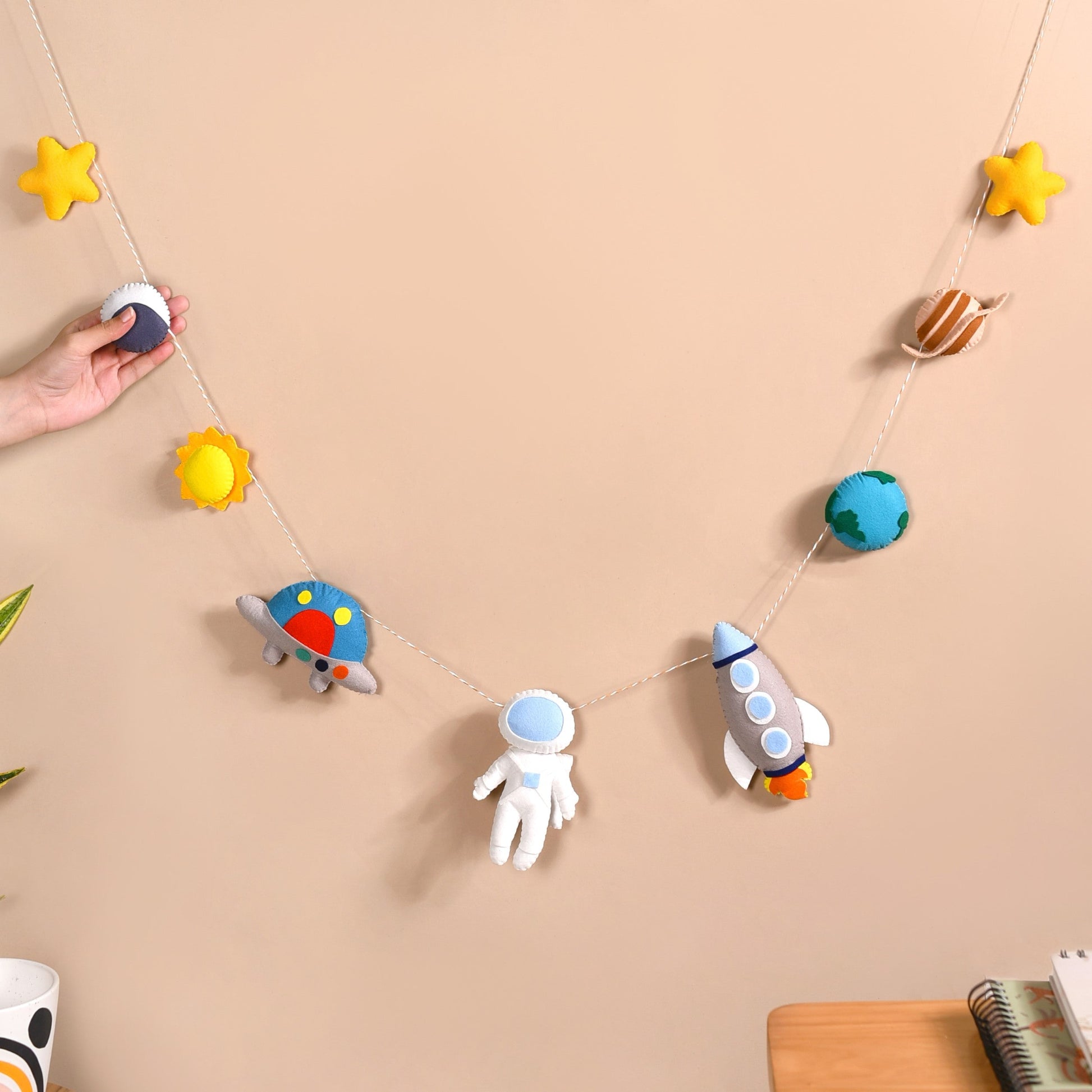 Benefits: This astro-themed bunting is designed for effortless hanging on cribs, bassinets, baby strollers, and toddler beds, making it a versatile decor accent. Created from hypoallergenic felt, it’s safe and gentle for little ones. It’s low-maintenance and visually engaging, encouraging motor skills development while adding character to your nursery space.