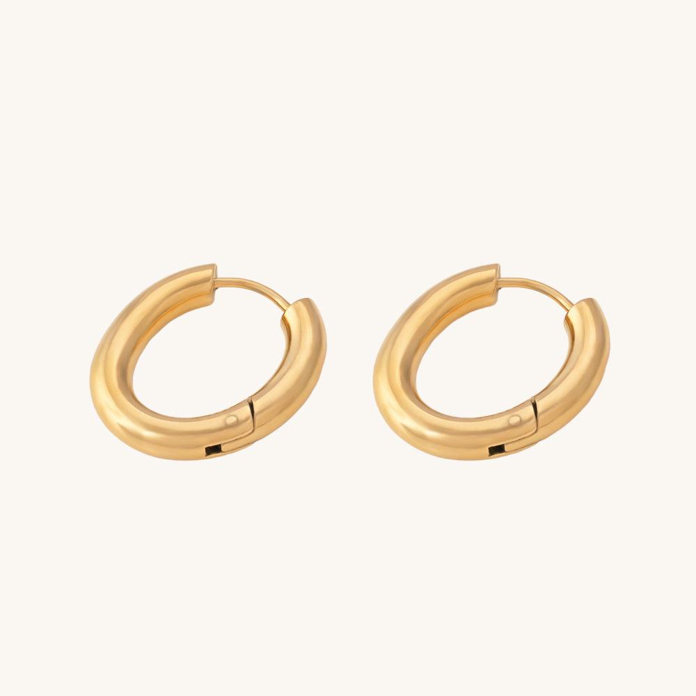 Sleek and contemporary, these 18k gold plated Oval Hoop earrings bring a modern twist to classic hoop designs. The polished gold finish ensures a radiant shine, and their waterproof, anti-tarnish quality keeps them looking flawless for everyday wear or special occasions. Perfect for adding a touch of elegance and sophistication to any outfit.