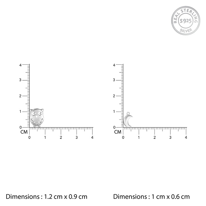 This silver necklace has an owl design with a crescent-shaped moon charm on its side.