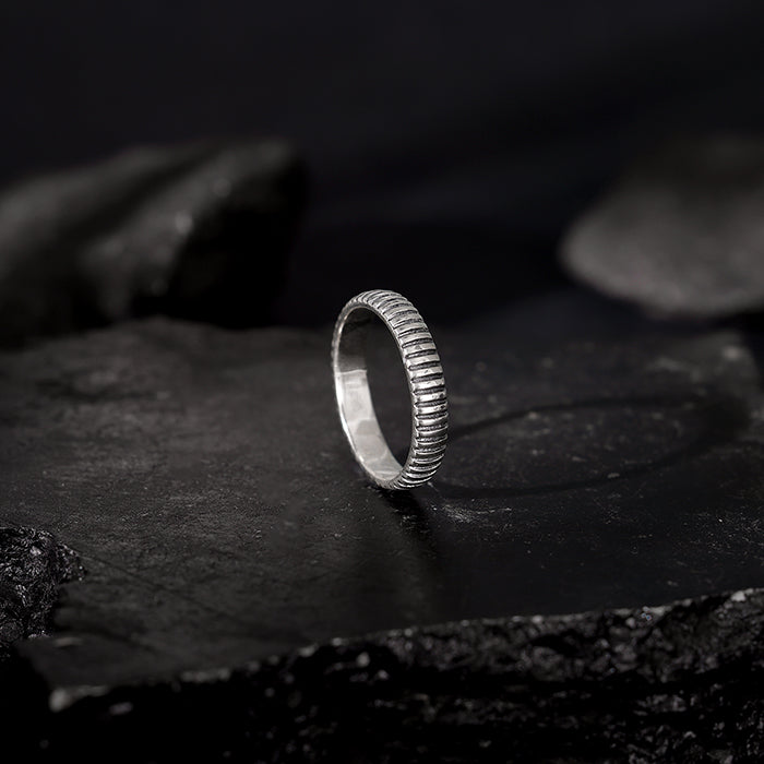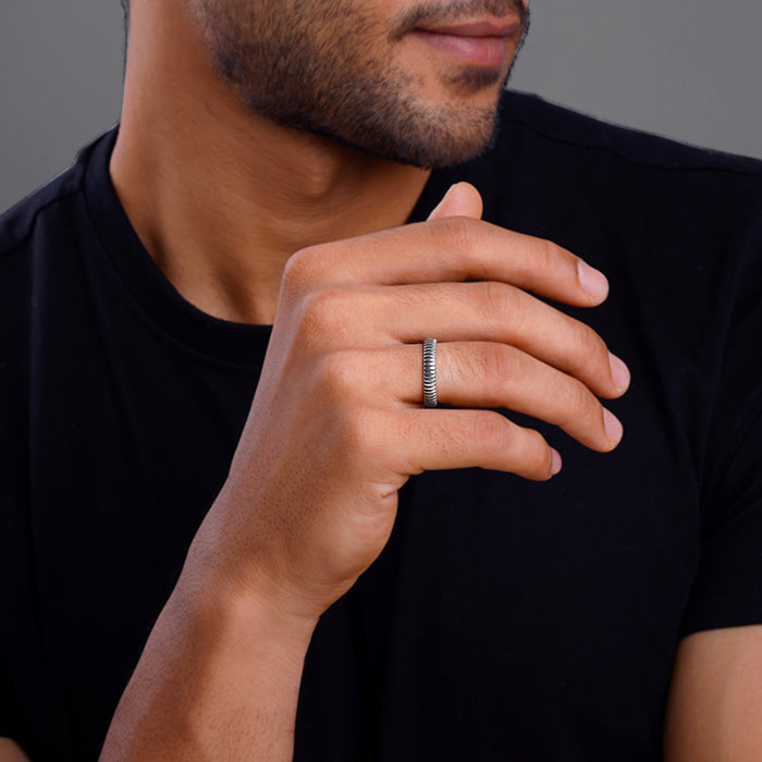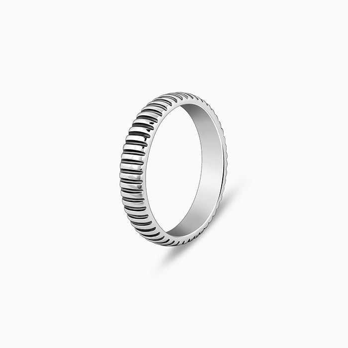 This oxidised silver ring for men has a minimalist design with a textured band.