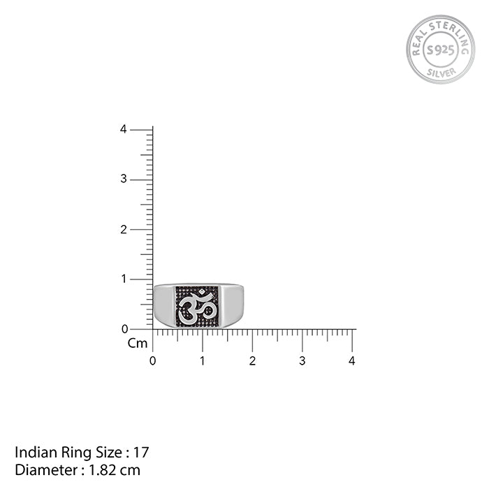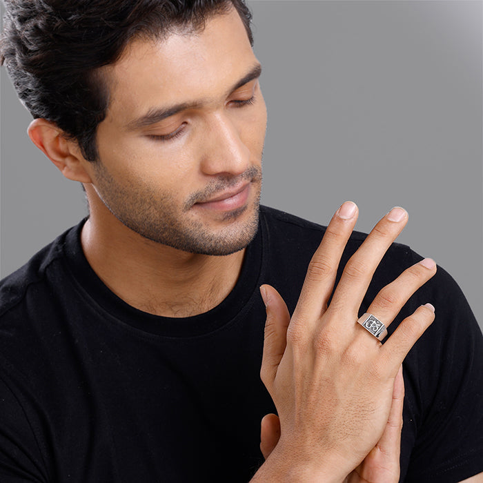 This mens silver ring features a bold square face with a black textured grid pattern, with the centre set by an Om symbol.