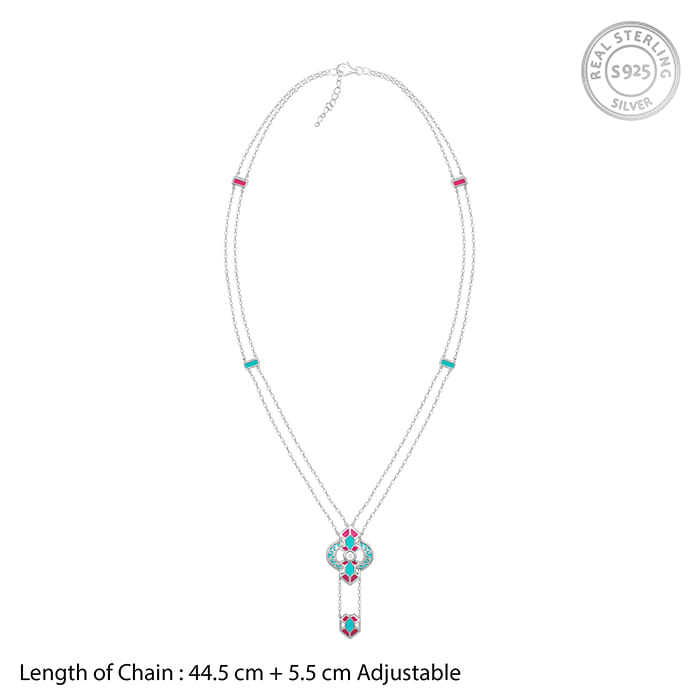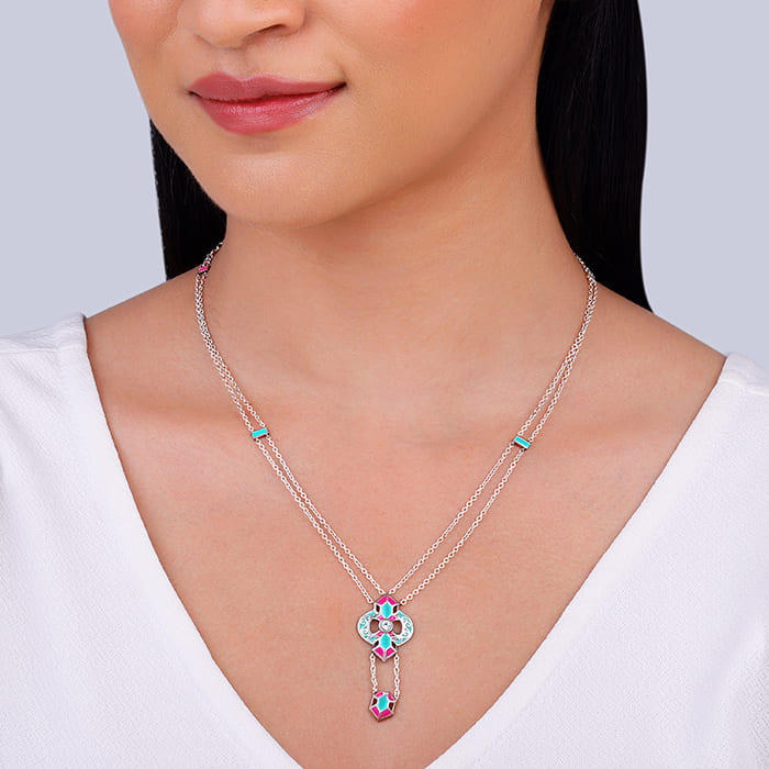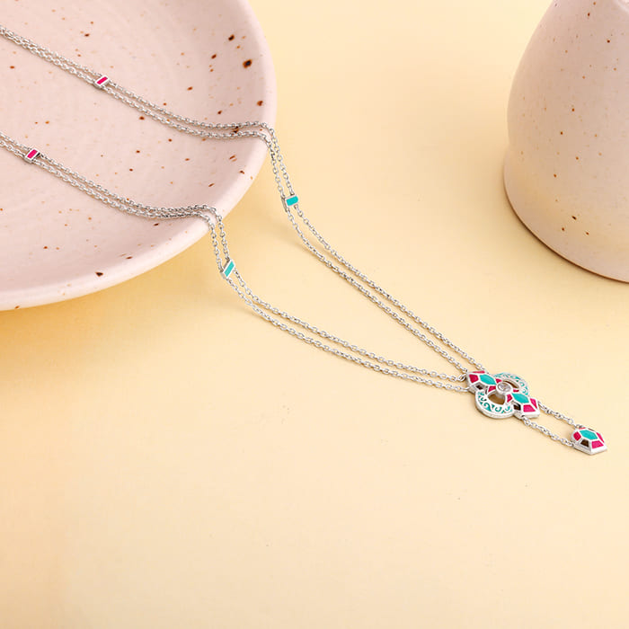 This oxidised silver lariat necklace features a quatrefoil design with enamel and zircon, making it truly unique.