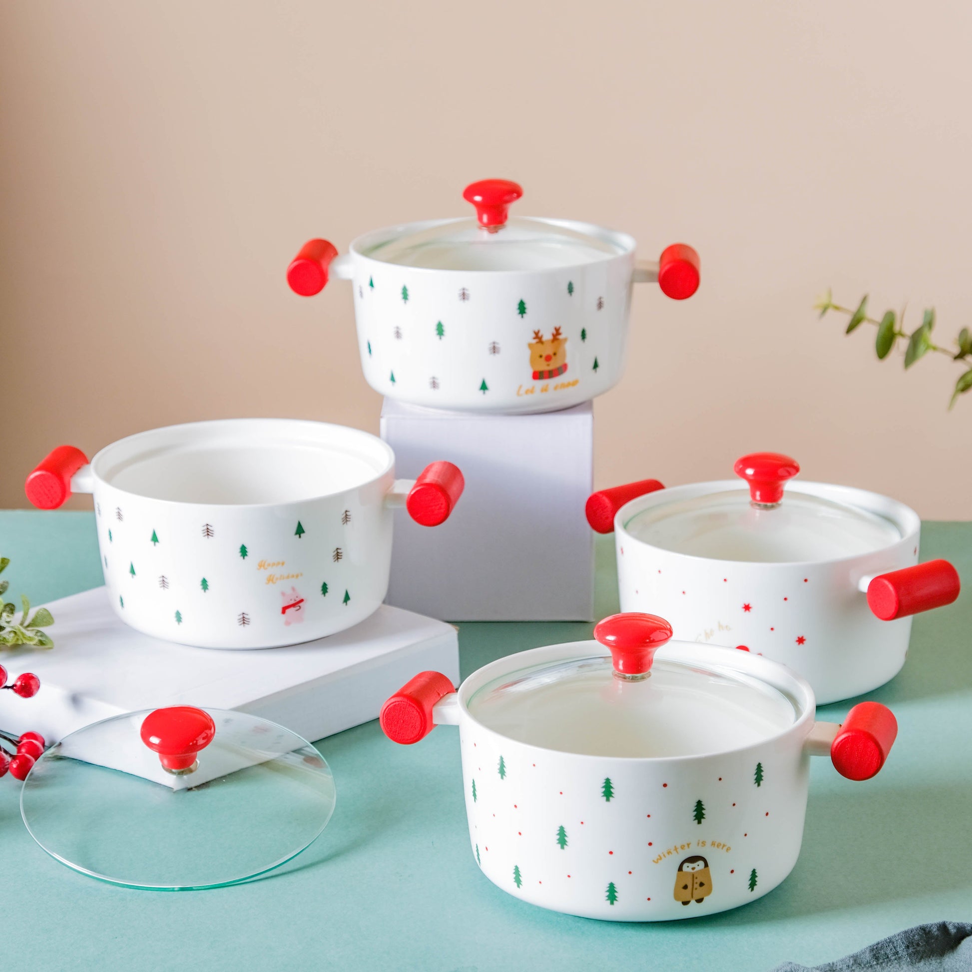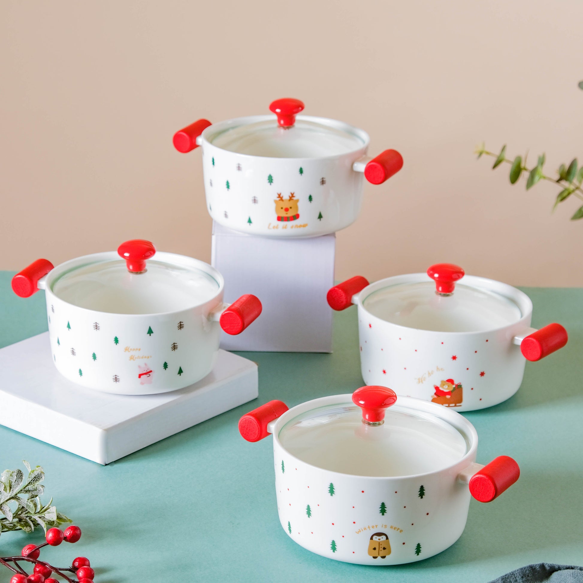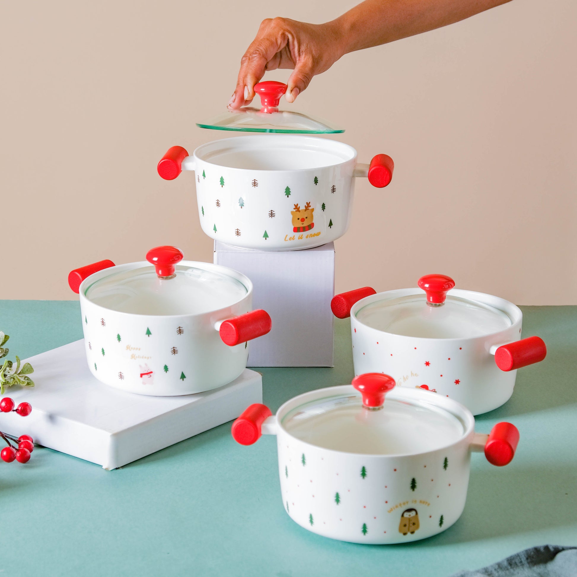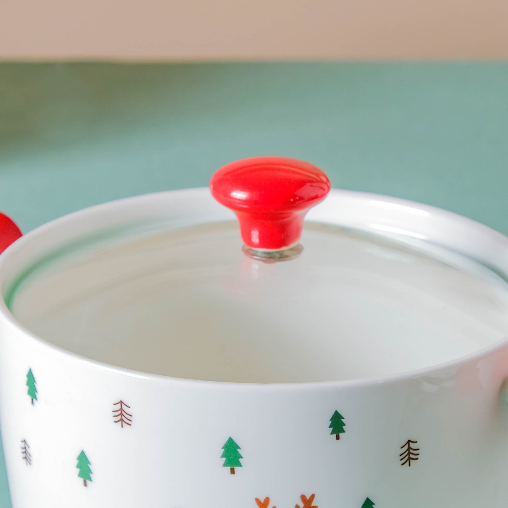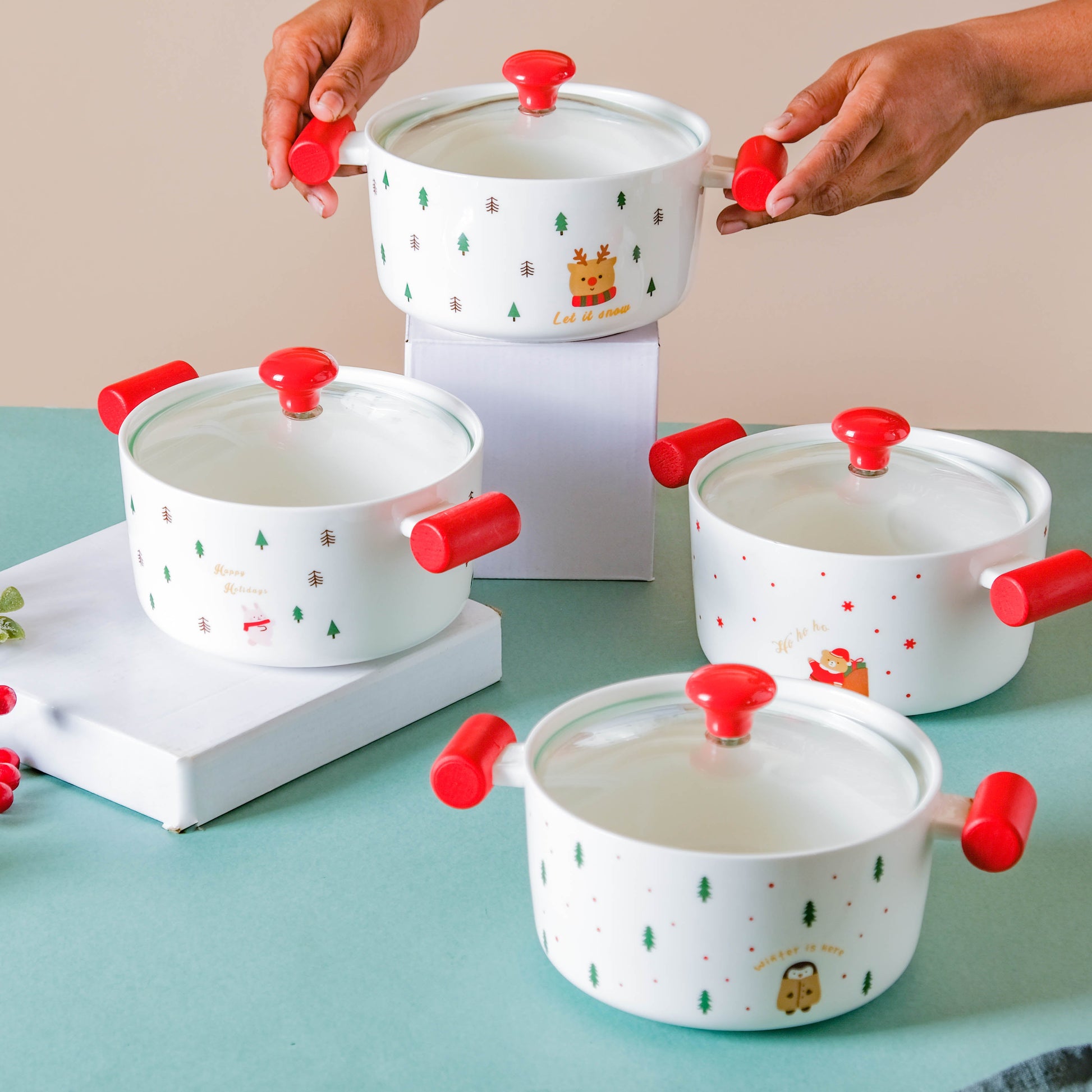 The ceramic bowl comes with a lid adorned with a red knob and handles and embellished with multi-colored dots which gives it a festive feel. Serve noodles, ramen, soup, or stew in the ceramic serving bowl. The cylindrical handles of the serving dish look rather unique. The bowl features intricate designs on its outer surface in the form of trees, flowers, penguins, reindeers, and so on. One could also use the dish to reheat food or simply bake or grill dishes in the microwave oven. Use the bowl in the microwave oven and dishwasher without the lid.