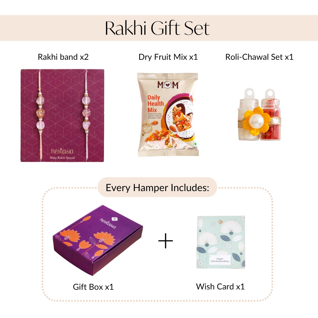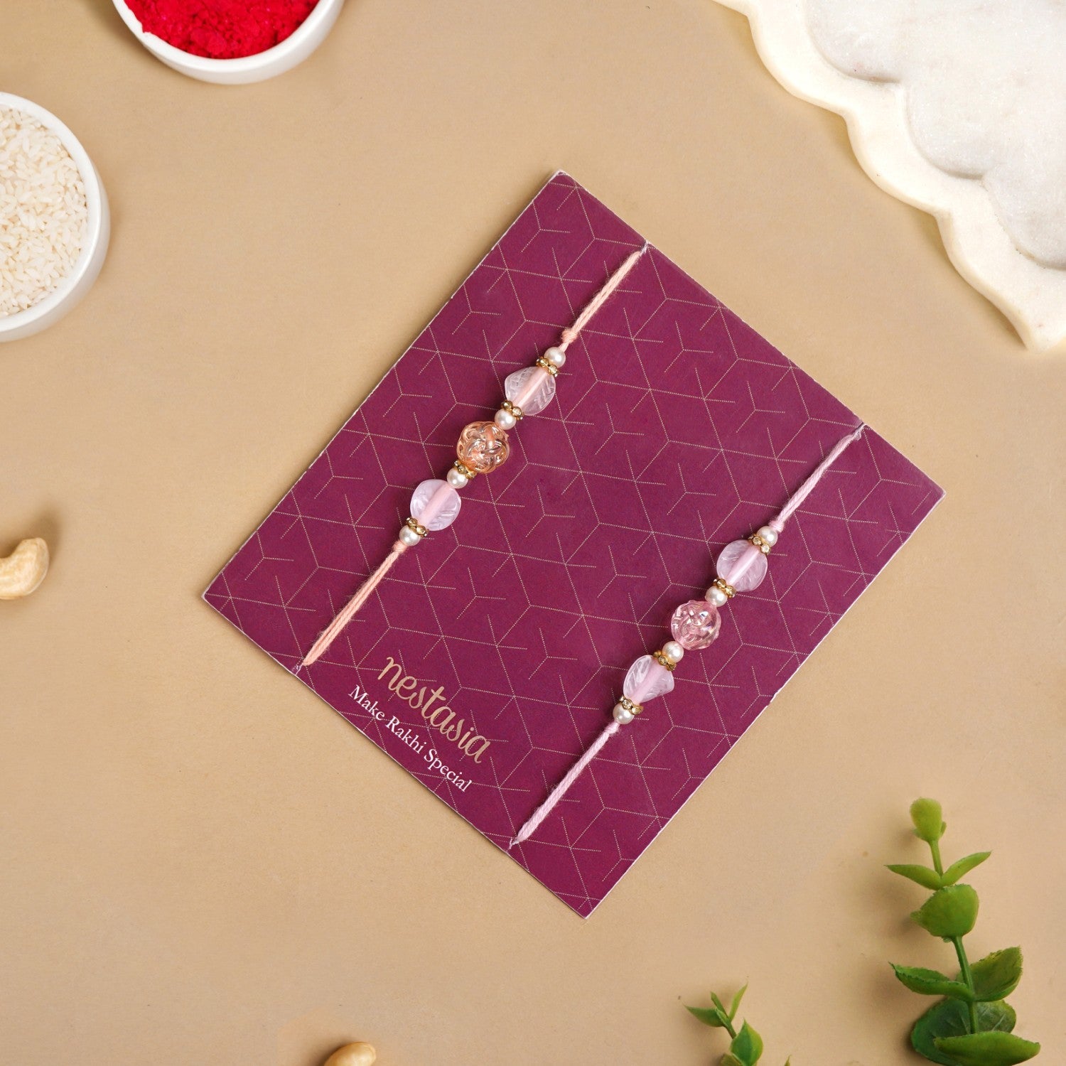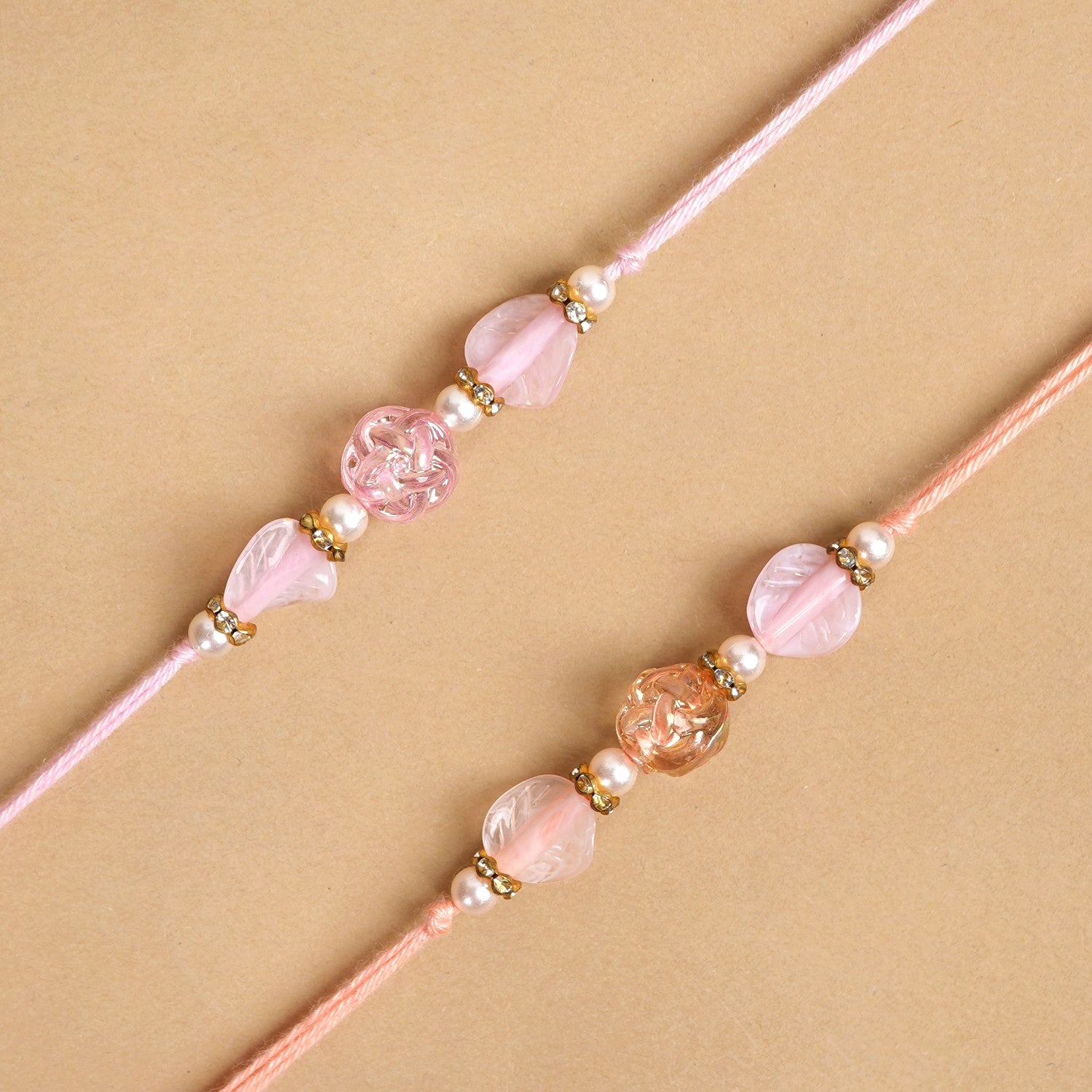 Express your love and affection with this thoughtfully curated Rakhi set, designed to make your celebration truly special and memorable. The set includes two elegant rakhis, one in soft peach and the other in delicate pink, each crafted with care and attention to detail. Both rakhis feature matching threads and are adorned with transparent leaf motifs, medium-sized beads, tiny pearls, and shimmering stones that beautifully blend traditional charm with contemporary aesthetics. The set also features a roli-chawal bottle set, a pack of mixed dry fruits, a gift box, and a wish card.