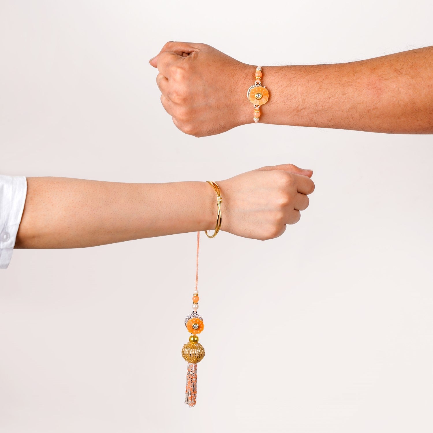 This soft toned Rakhi with a matching lumba is symbolic of the precious bond between brother and sister or even sisters. The Lumba has a dangling tassel attached to a tiny mirrorball. The Rakhi is beautifully curated in a flowery shape with a white stone at the centre to act as a highlighting catalyst. Just like the everlasting bonds between siblings, the gift hamper is a timeless collection, curated with attention to detail. It includes 1 Rakhi, 1 Lumba, 1 roli chawal bottle set, 1 pack of dry fruits, and 1 wish card.