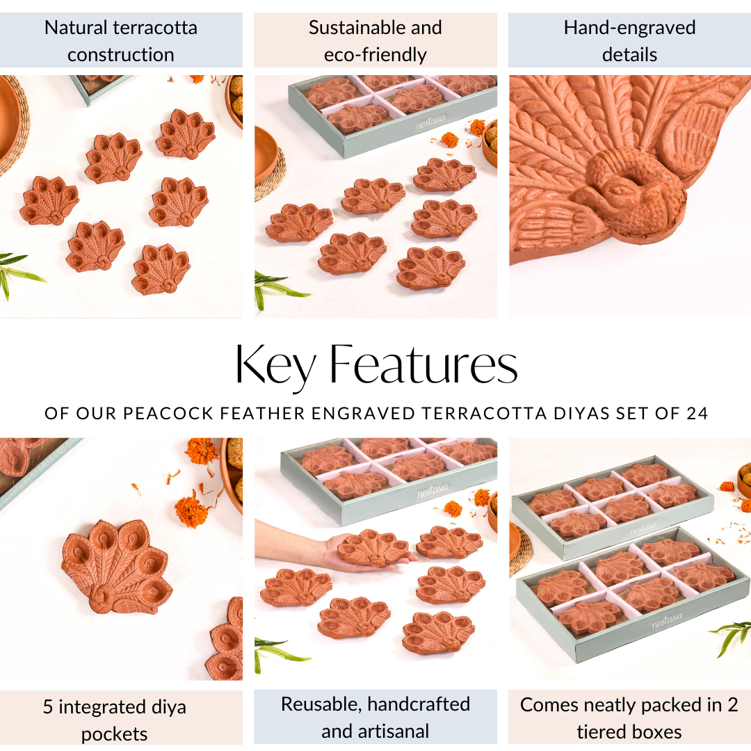 Peacock Feather Engraved Terracotta Diyas Set Of 24