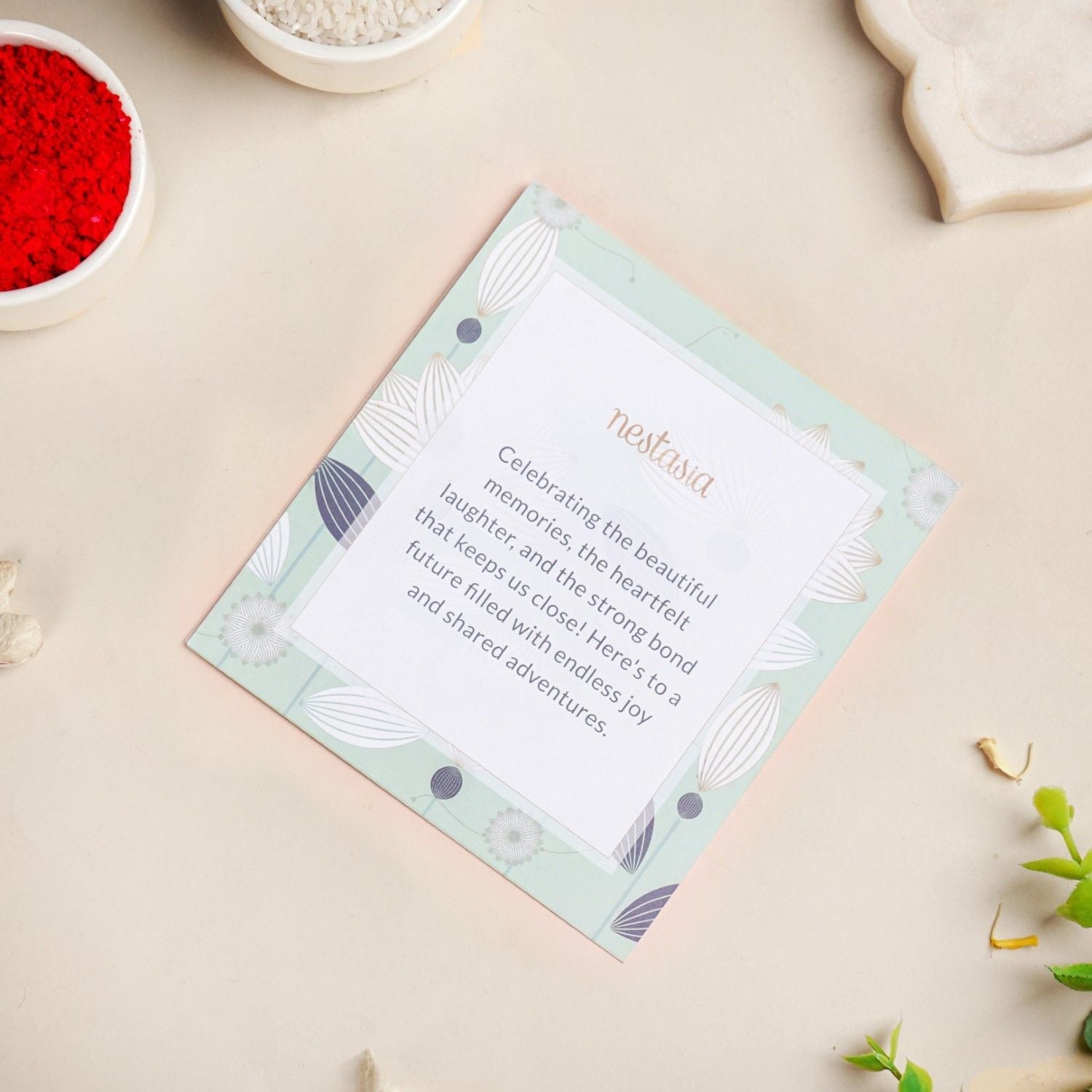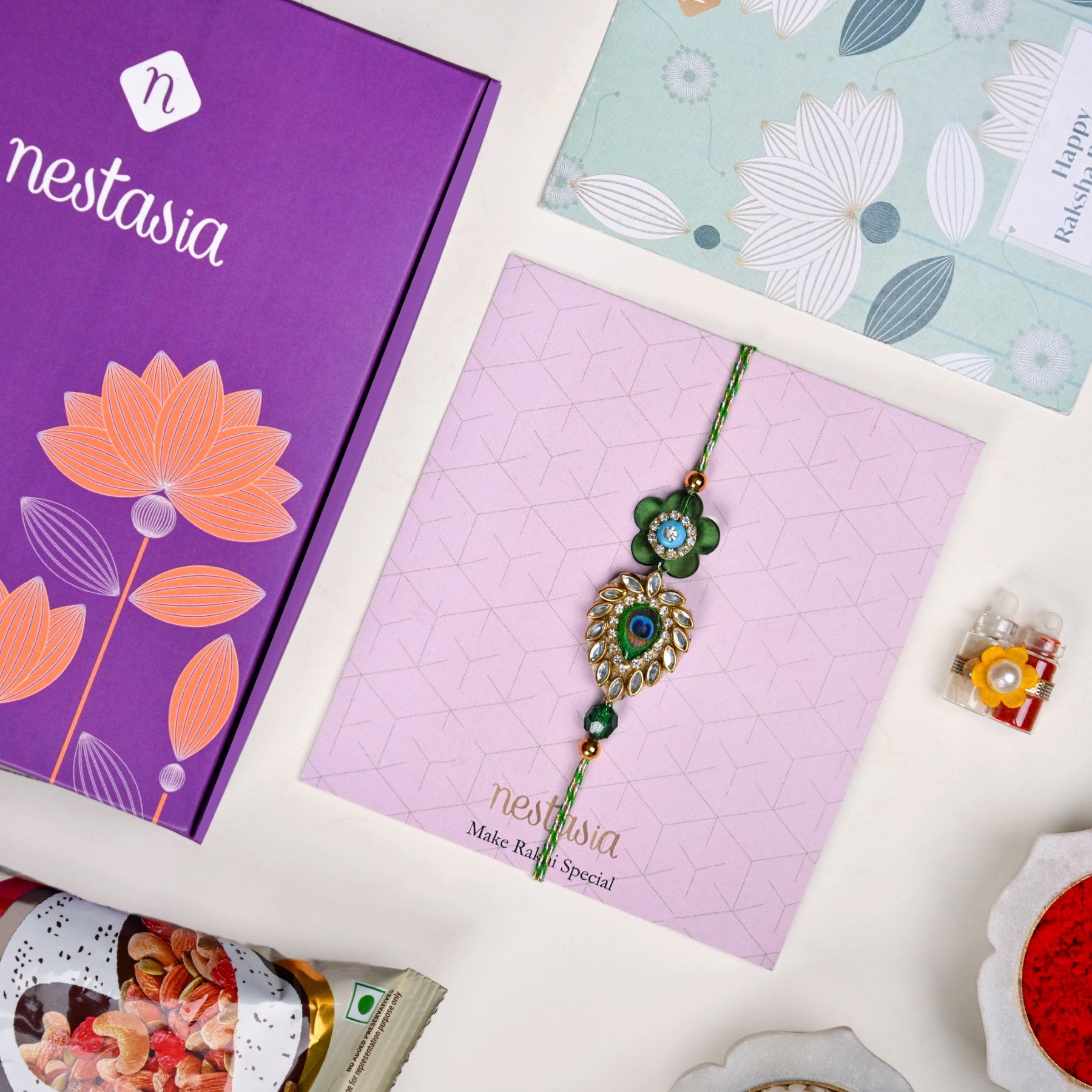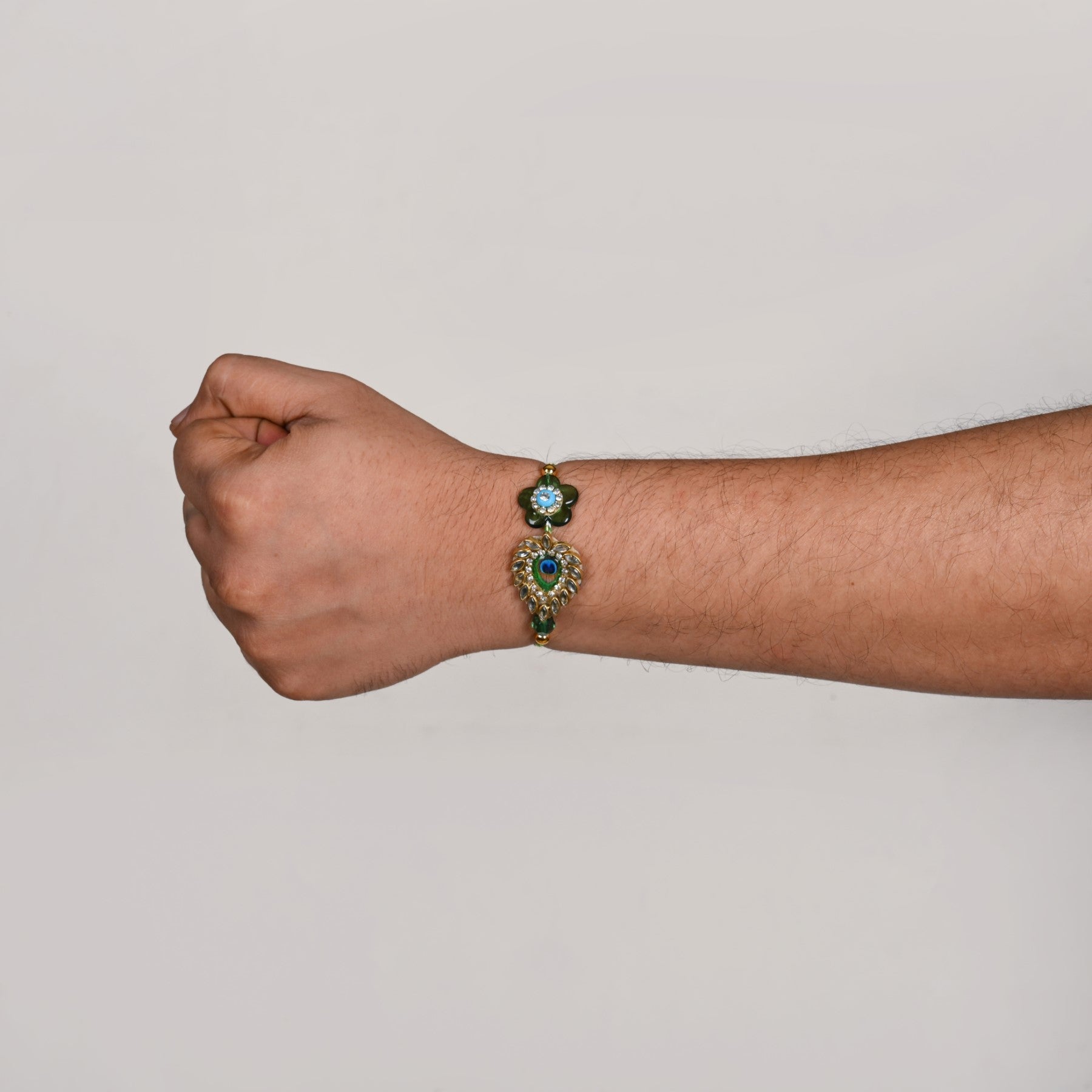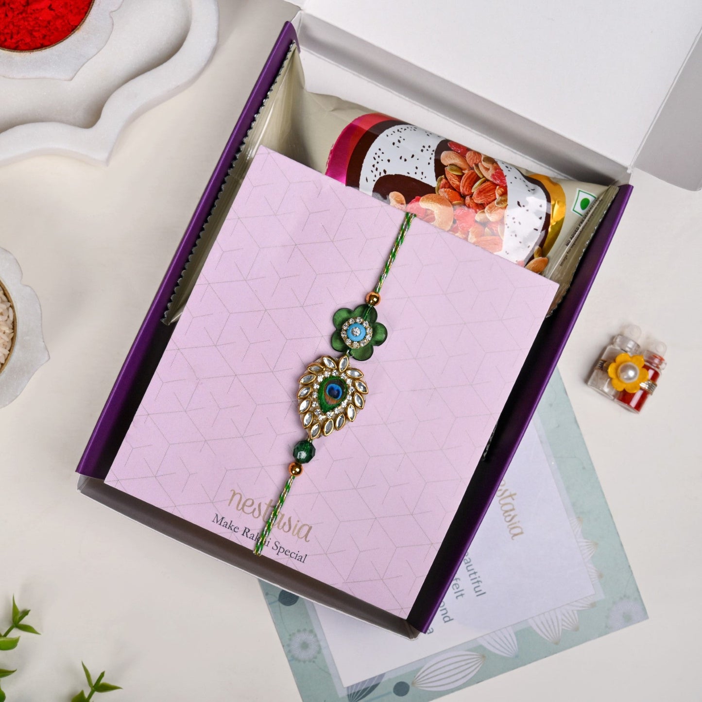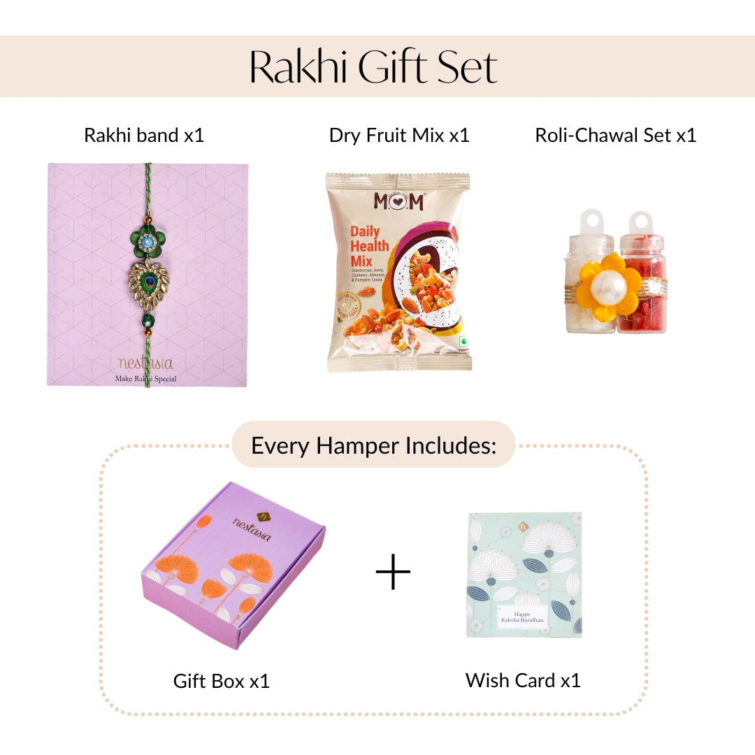 A beautiful Rakhi for brother that blends heritage and style, this piece is perfect for honouring sibling bonds with festive elegance. Designed to stand out on Raksha Bandhan, the rakhi features a stunning peacock feather-inspired motif encircled by shimmering kundan stones and a rich green floral motif, finished with a royal blue rhinestone. The silver-edged transparent base lends a modern charm, while twisted green and white threads with golden beads complete the look with traditional finesse. Thoughtfully handcrafted, this designer rakhi is a heartfelt tribute wrapped in vibrant detail. The rakhi comes as a complete part of a set which includes 1 rakhi, 1 dry fruits packet, 1 wish card and 1 roli-chawal bottle set.
