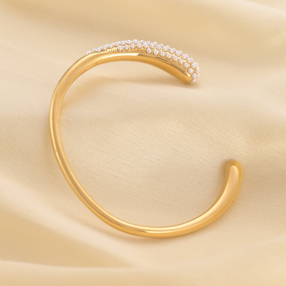 Introducing our exquisite 18k gold tone plated-plated bracelet, a symphony of elegance and sophistication. This resplendent piece features a unique design, where a row of luminous pearls graces one side, creating a captivating juxtaposition against the gleaming gold. Embrace sophistication and make a statement with this 18k gold tone plated-plated bracelet.
