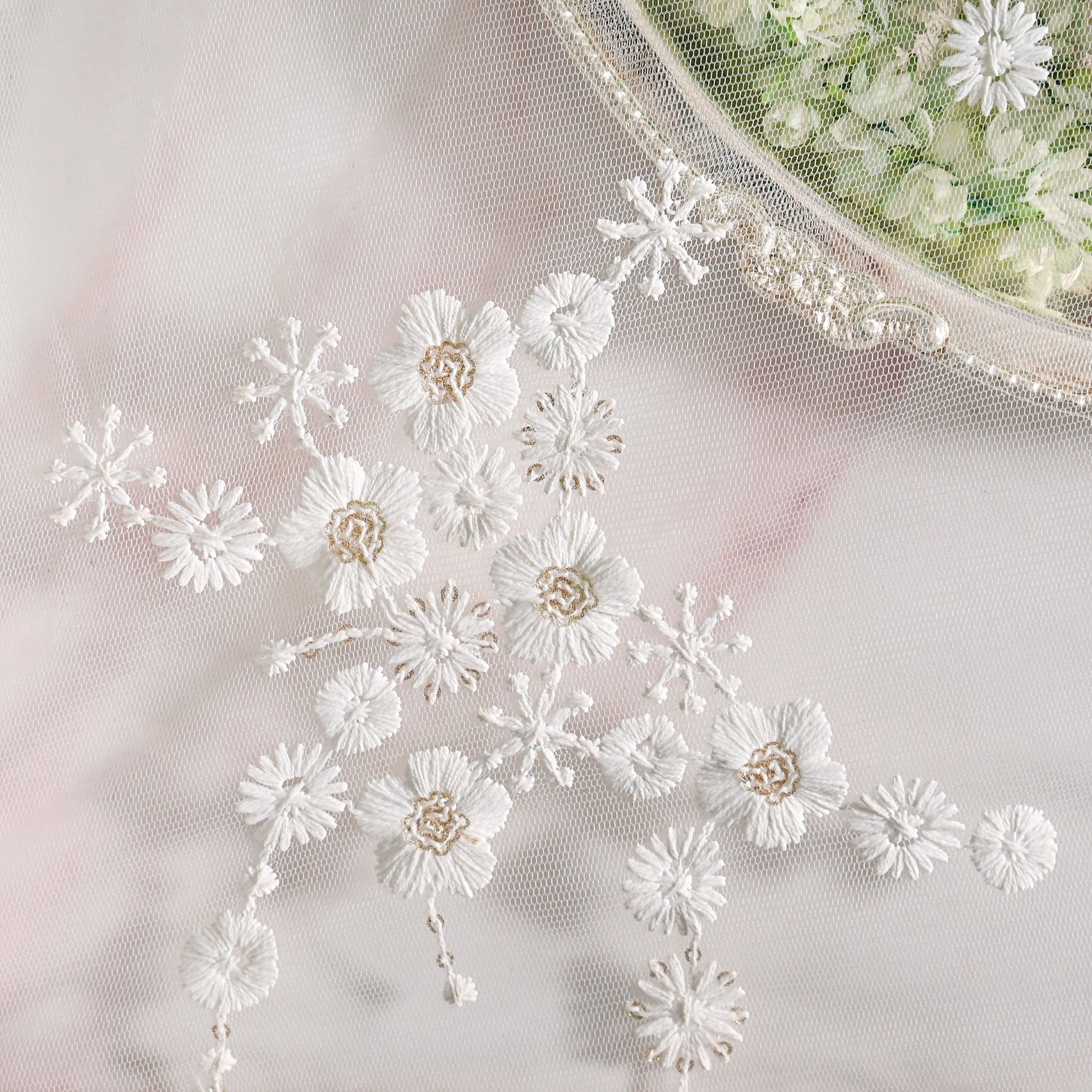 Design: Crafted from sheer net fabric, each square-shaped cover features scattered sequin embroidery across the surface. A broad embroidered lace outlines the edges with intricate threadwork detailing. The borders are finished with looped golden beads and pearl drops that add gentle weight and structure. Soft and semi-transparent, the covers create an elegant layered effect without fully concealing the contents. Sold as a coordinated set of two for a balanced ceremonial setup!