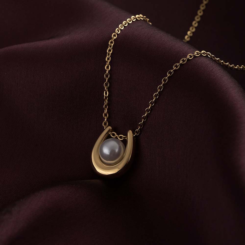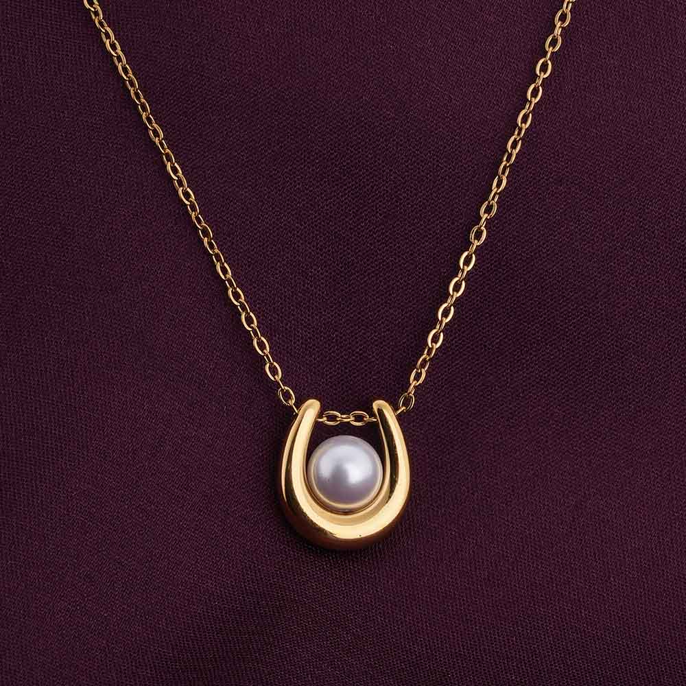 Our new Pearl Embellished U Necklace, features a captivating U-shaped pendant embellished with a graceful pearl stone.