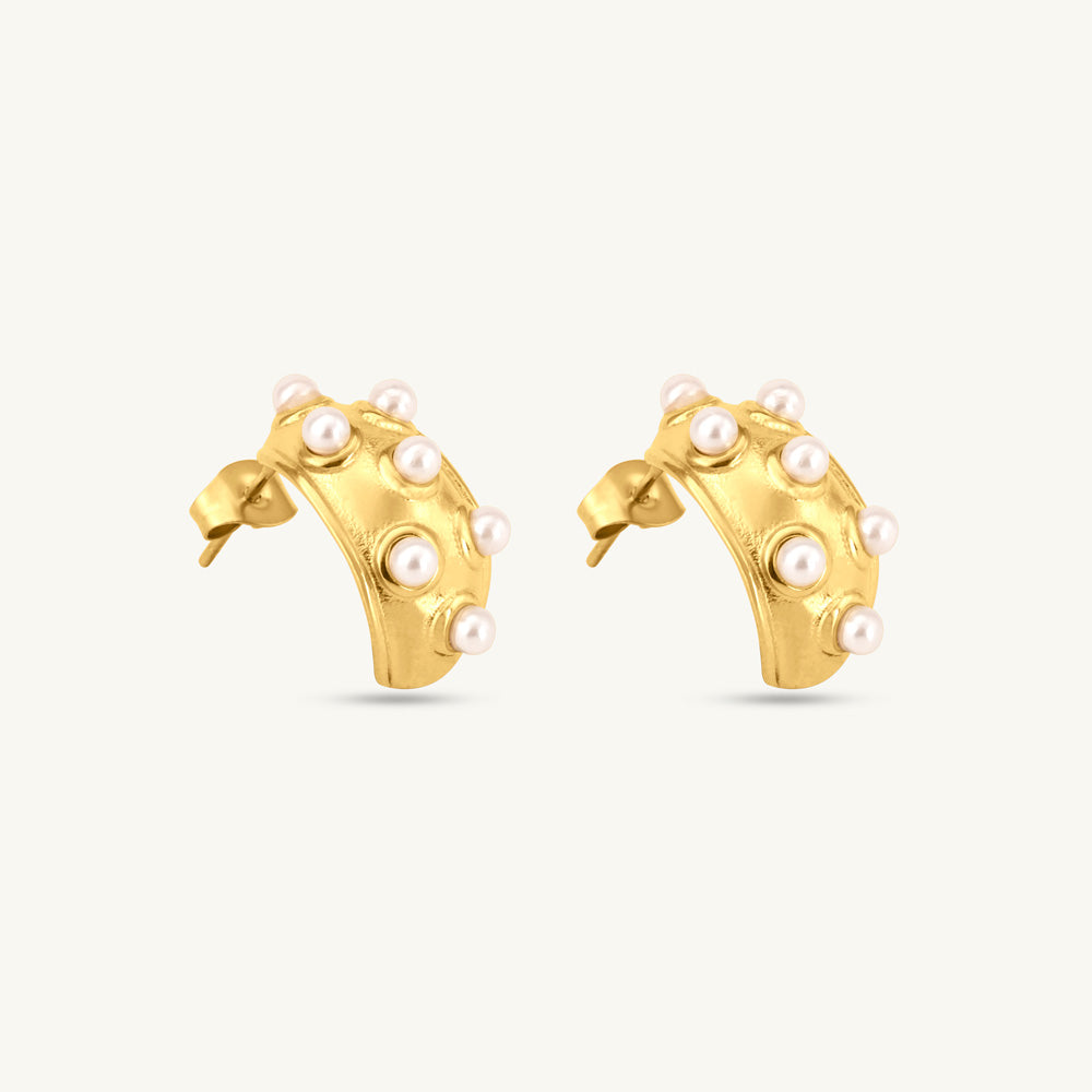 A blend of armor and elegance, these Pearl Shield Half Hoops feature a golden shield motif topped with pearls. Bold yet feminine, they elevate both ethnic and modern outfits. Waterproof and anti-tarnish for enduring wear.