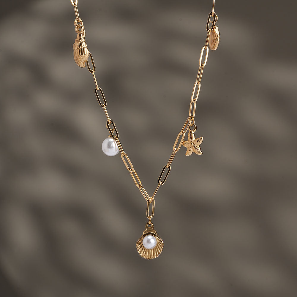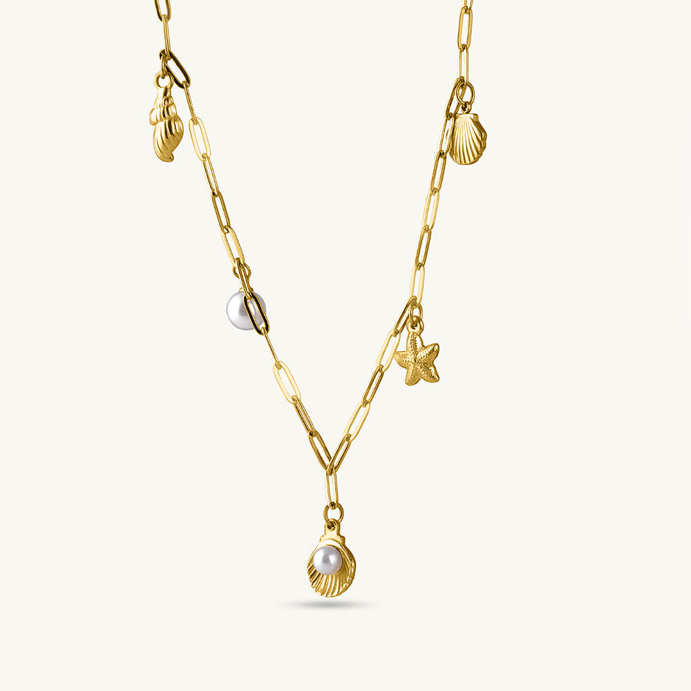 The Pearl Tides Necklace captures the serene beauty of ocean waves and timeless elegance. Crafted in stainless steel with a radiant gold tone finish, it features a luminous pearl at its center - symbolizing purity and calm. Waterproof, anti-tarnish, and skin-friendly, this necklace adds a touch of refined sophistication to any look, making it a versatile piece for both day and evening wear.