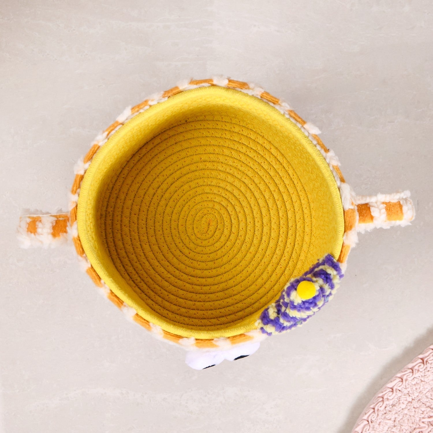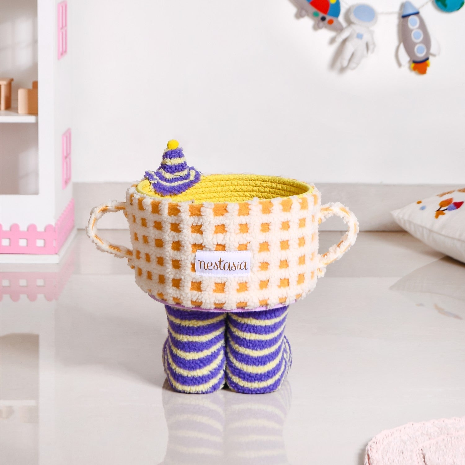 Design: Created lovingly with a unique woven checkered pattern in warm yellow and cream tones, this plush basket brings a cosy aesthetic to any room. Its large, animated eyes add a touch of whimsy, while the soft, striped plush legs in purple and yellow give it a quirky character. The cutest detail? A tiny, plush hat sitting on the rim, completing its adorable look! Built with a sturdy MDF inner lining for structure and durability, the basket also features a roped cotton inner lining, ensuring a soft yet reinforced storage space. The sturdy side handles make it easy to carry, while the high-quality craftsmanship ensures it stands tall and proud, ready to organise your space.