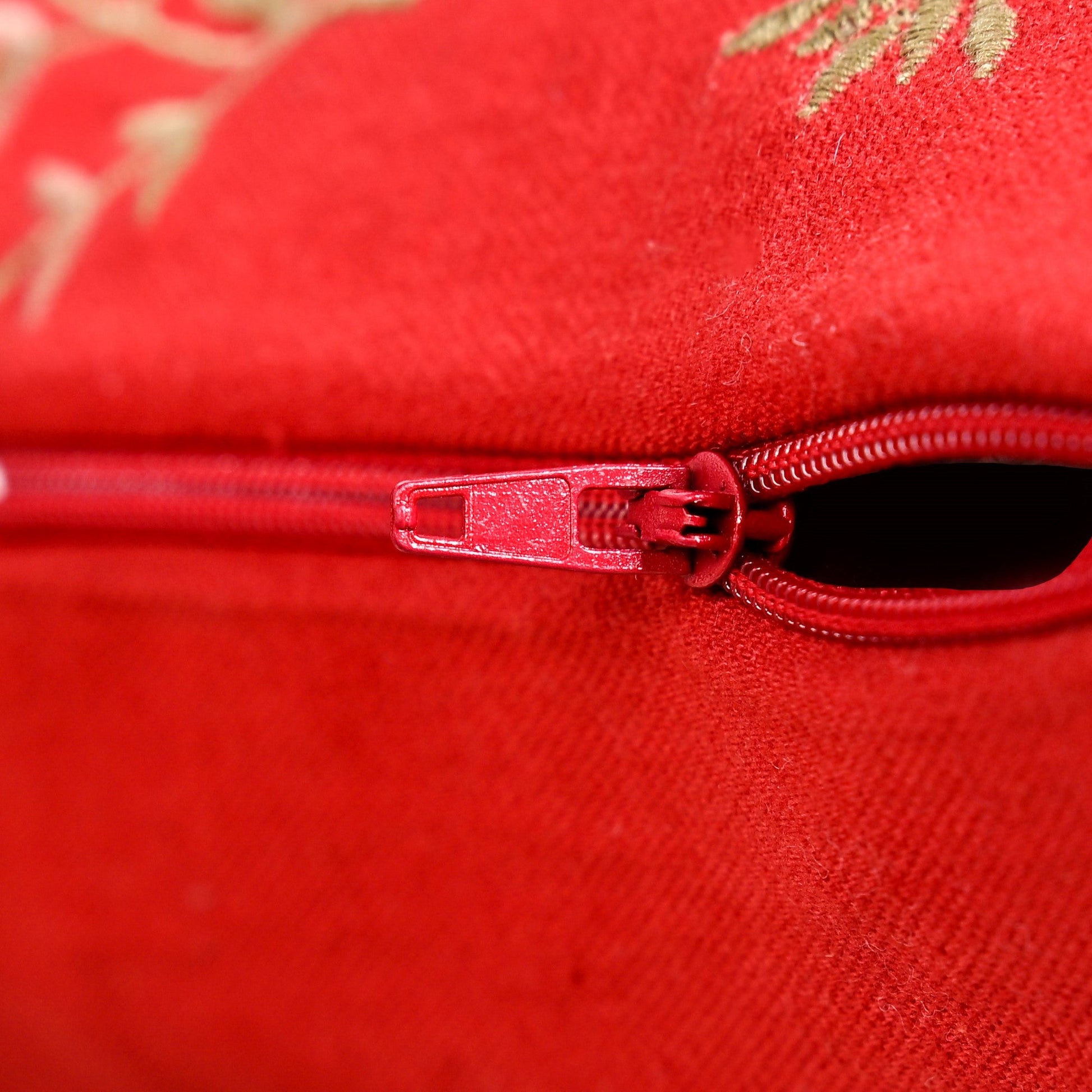 Design: The cotton cushion cover features a delightful mix of pine leaves, mistletoes, and snowflakes delicately embroidered to evoke the spirit of the holidays. Combining hand and machine embroidery, the detailed patterns stand out on the 100% cotton chambray fabric in bright red. A smooth concealed bottom zipper ensures a seamless finish, making the pillow cover as practical as it is charming.