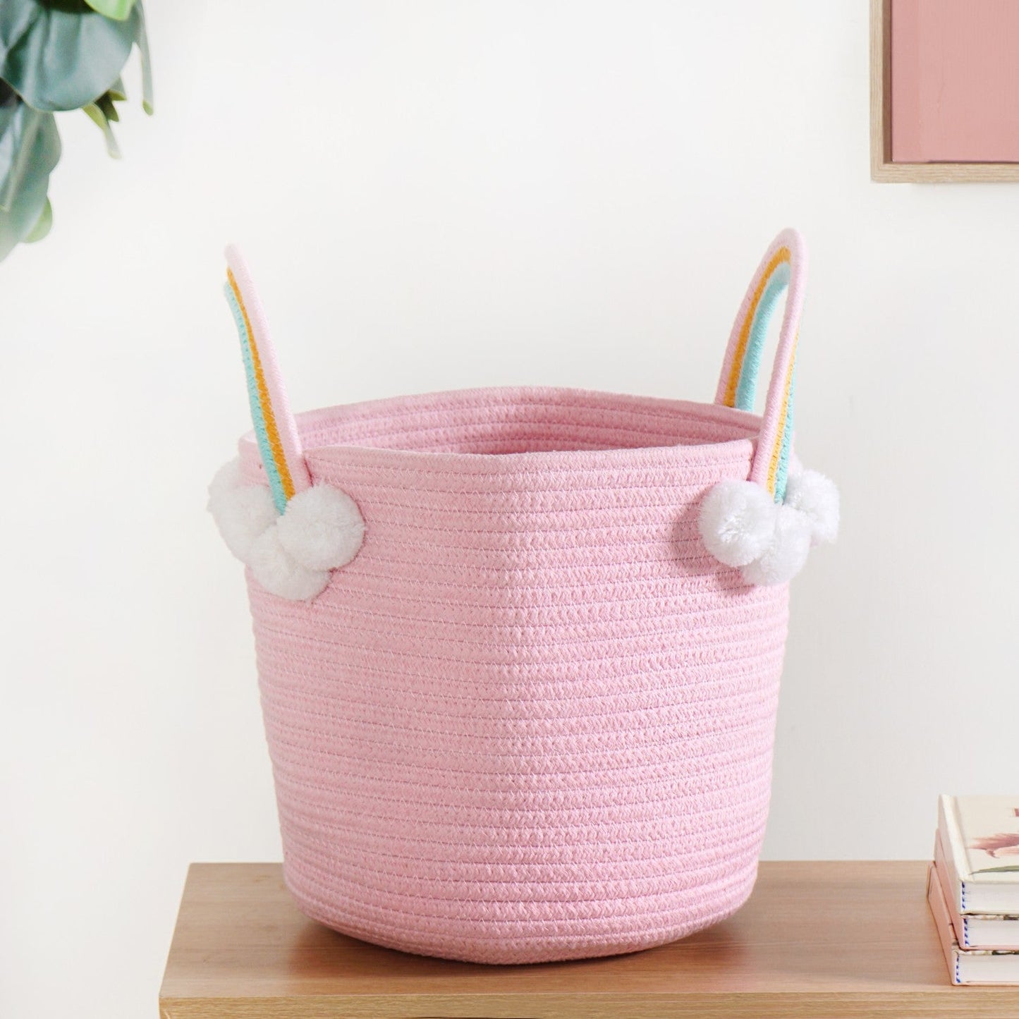 Brighten up your little one’s room with this dreamy storage basket, designed to bring a touch of magic to everyday organization. Featuring a pastel pink base with adorable rainbow handles and fluffy cloud pom-poms, this organising basket makes tidying up feel like a fairy tale. Easy to carry, it’s perfect for storing toys, books, clothes, and all your child’s little treasures. Whether used as a laundry basket or a charming room accent, this basket blends functionality with whimsical charm.