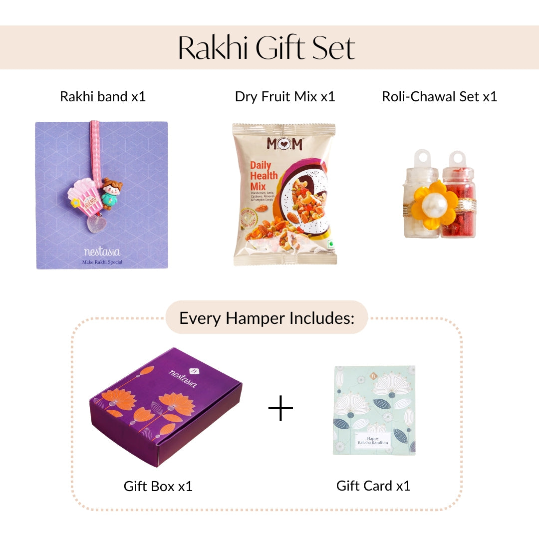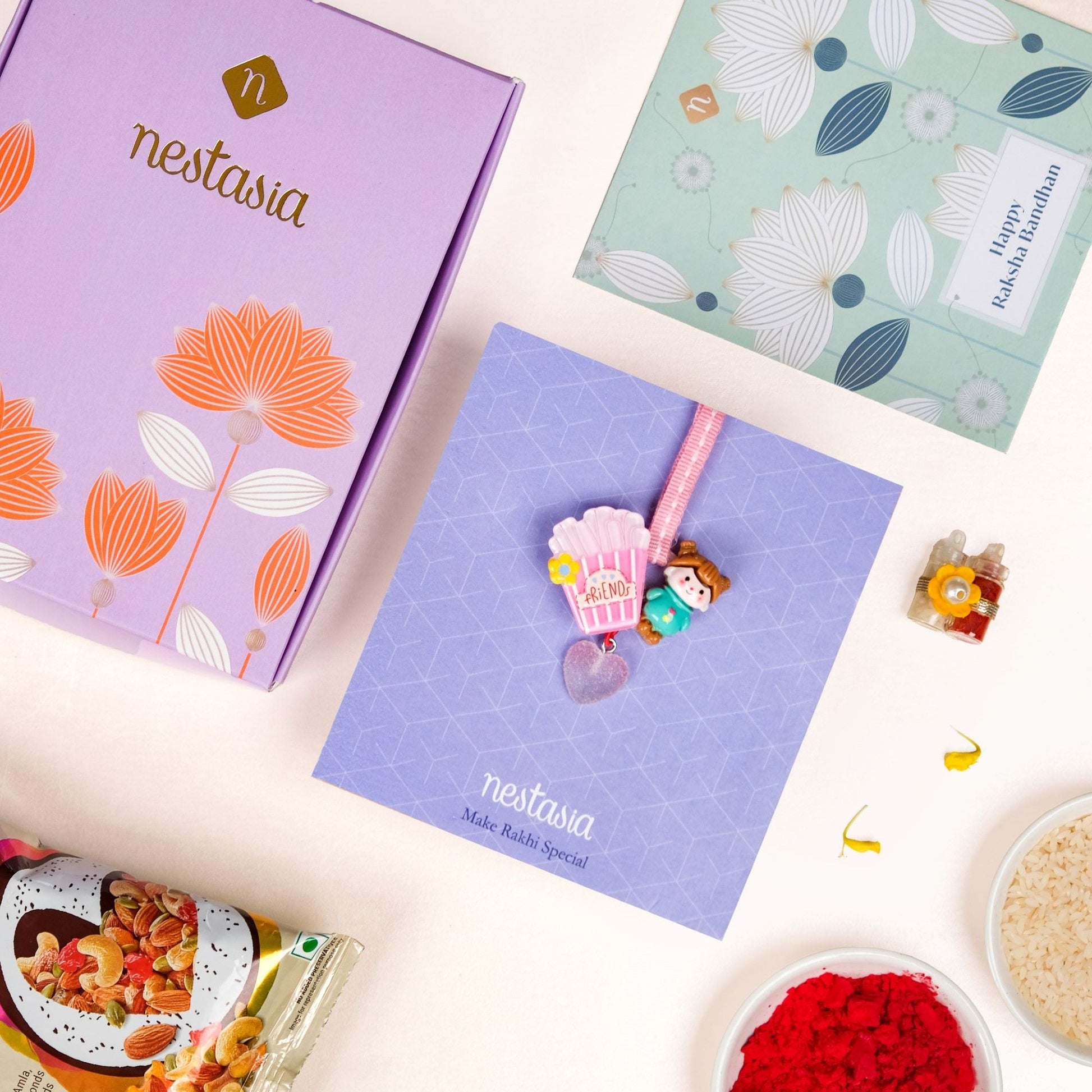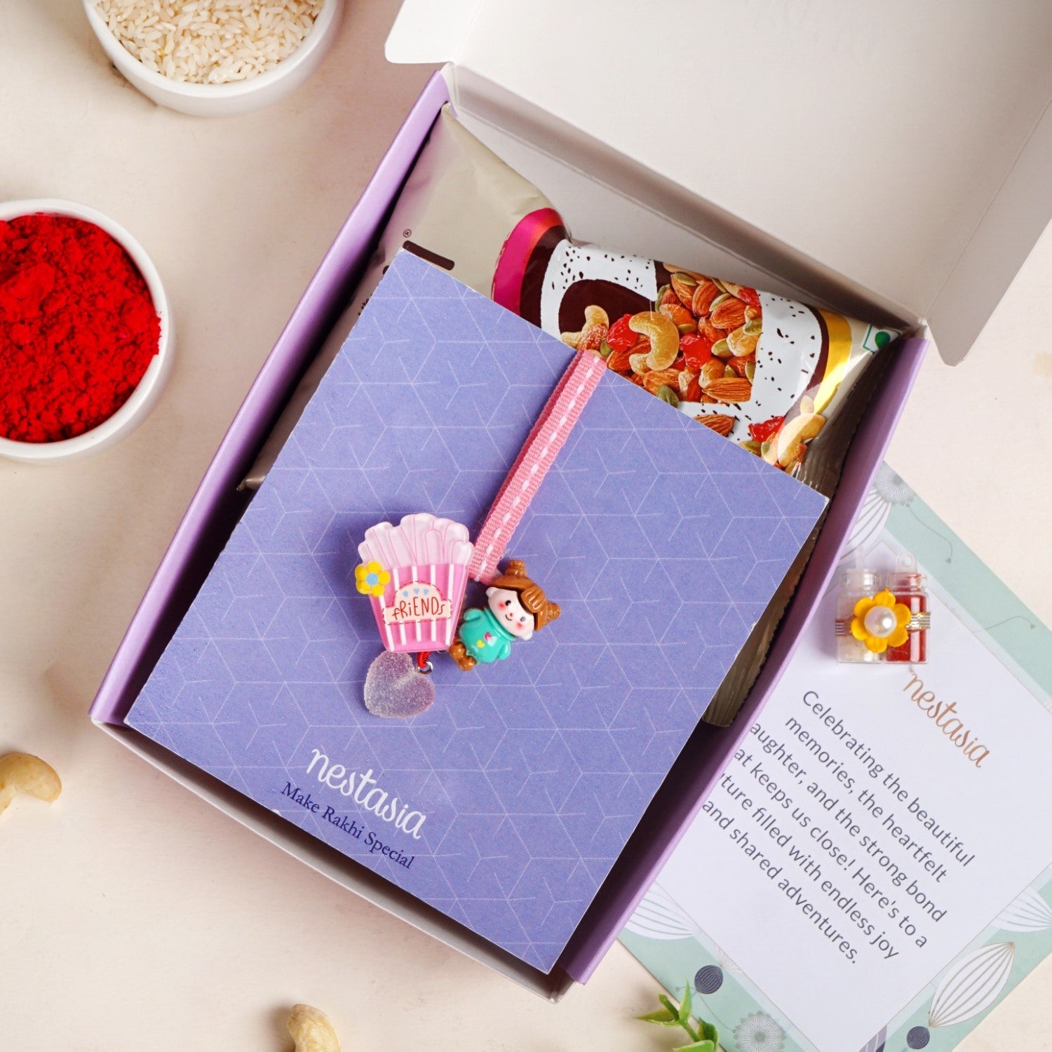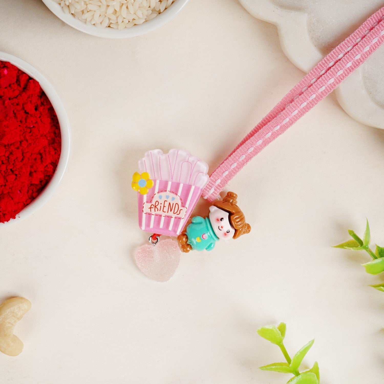 Our cute pink Rakhi gift hamper is just the right pick for little sisters. The pretty pink ribbon is attached to a PVC material, which is also coloured pink and cut out in the shape of French fries with the text 'friends'. Along with that, it has a tiny doll with chubby cheeks and a crystal pink heart charm tied to it. The package includes 1 Rakhi, 1 packet of dry fruits, 1 wish card, and 1 roli chawal bottle set.