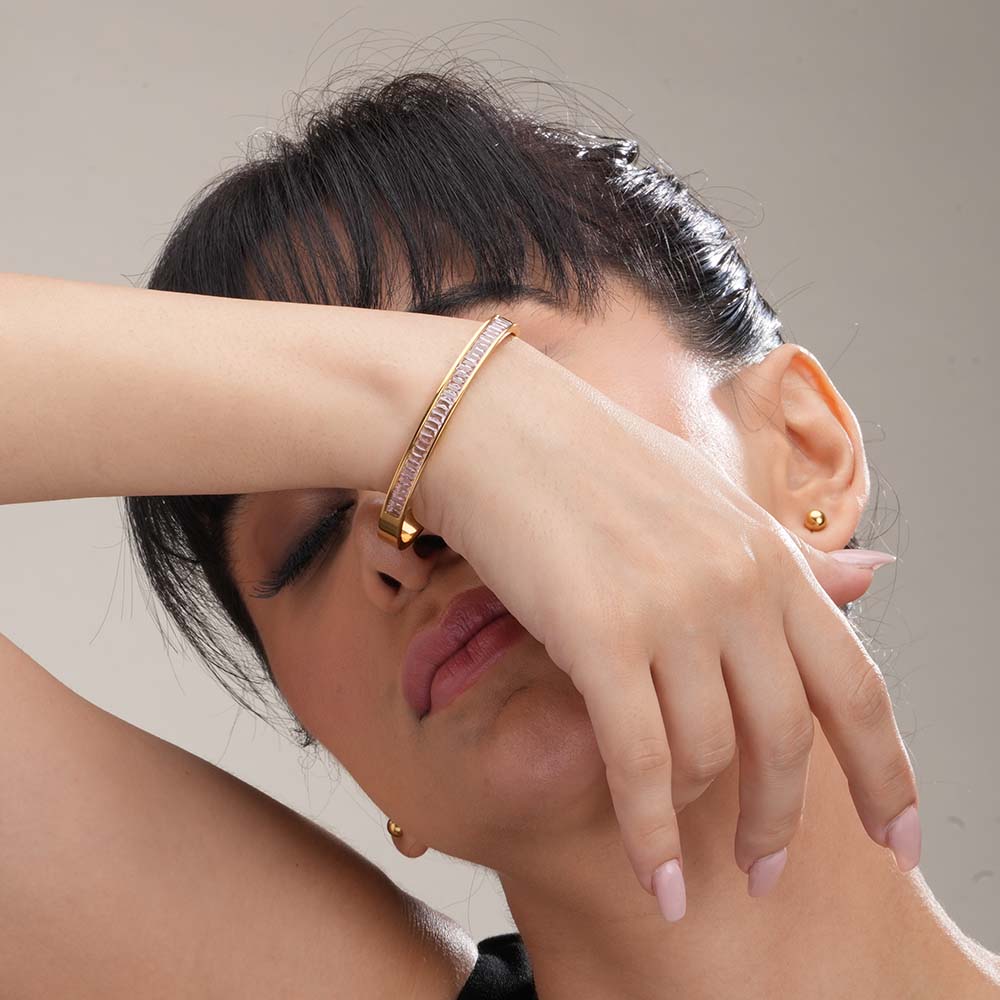 The Trendy Freak Pink Enchantment Bangle Bracelet is where subtle charm meets soft glam. Crafted with stainless steel and finished with 18k gold tone plating, it's a graceful nod to elegance with a playful twist. The hint of pink enamel just adds the right amount of colour, making this gold bracelet for women stand out in your demi fine stack. Whether worn solo or layered with your favourites, it's a piece that transitions effortlessly from day to night. A timeless design with just the right dose of whimsy made to charm, not shout.