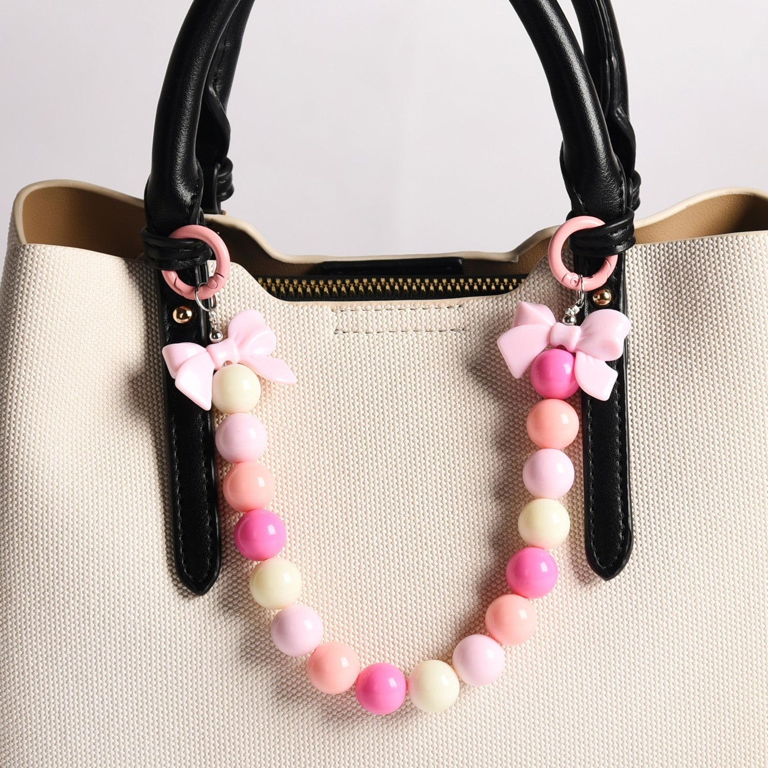 Add a pop of colour to your day with this fun keyring! Featuring a dangler of baby pink, magenta, off-white, and peach beads, it's a burst of joy in every swing. Two sweet baby pink bow charms on either side turn up the cute quotient, while the peach round metal lobster clasps add a touch of shine and functionality.