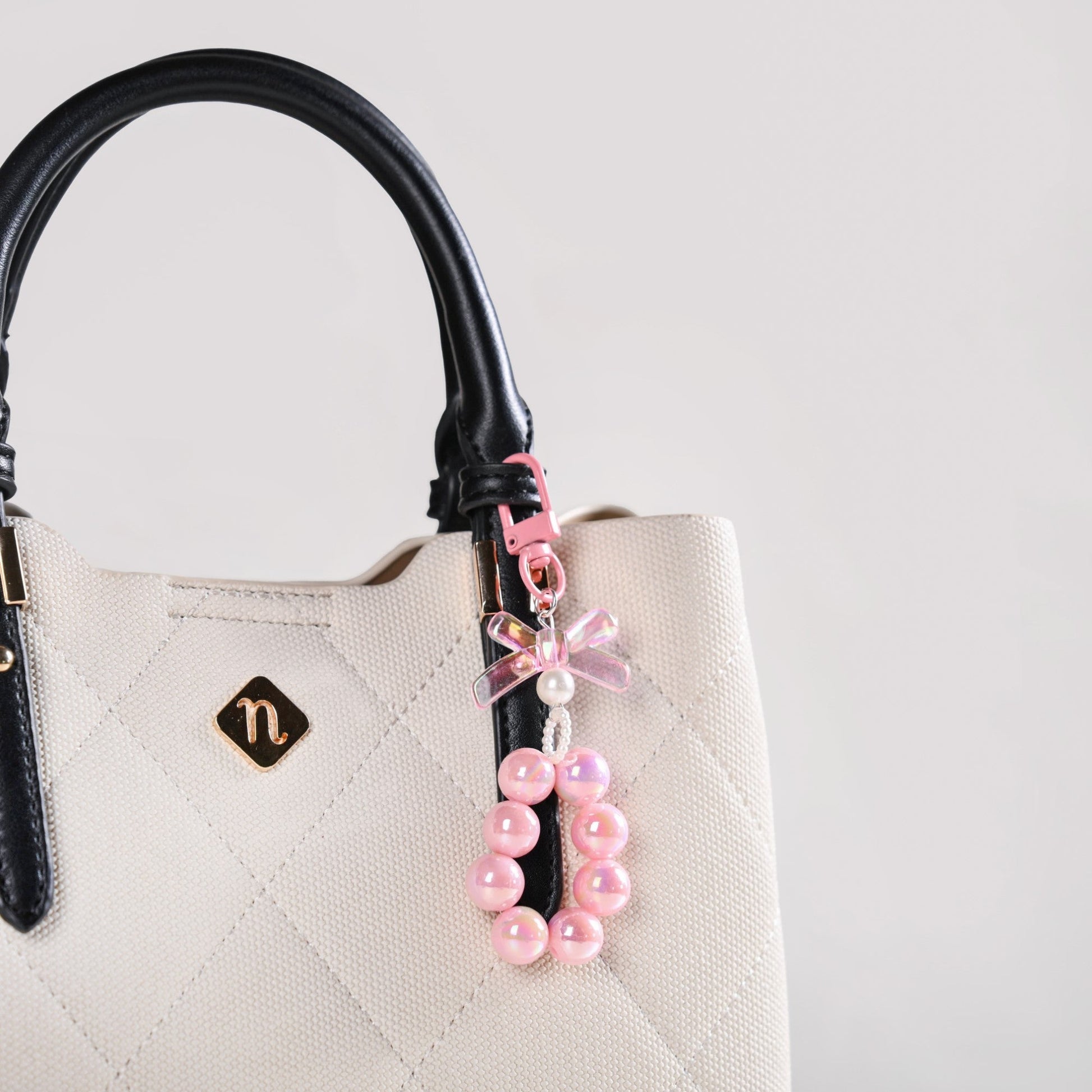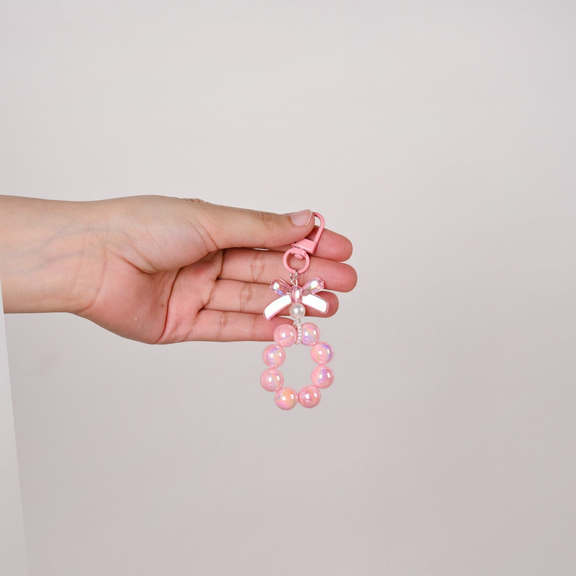 A splash of pink, a dash of sparkle, and a whole lot of charm - this cute keychain is here to steal the show! The pink lobster clasp comes attached with a matching pink bow charm with an iridescent finish, while a chunky pink beaded hoop below twinkles with a sparkling shimmer. The hoop is connected with a white pearl ring, adding that extra touch of elegance.