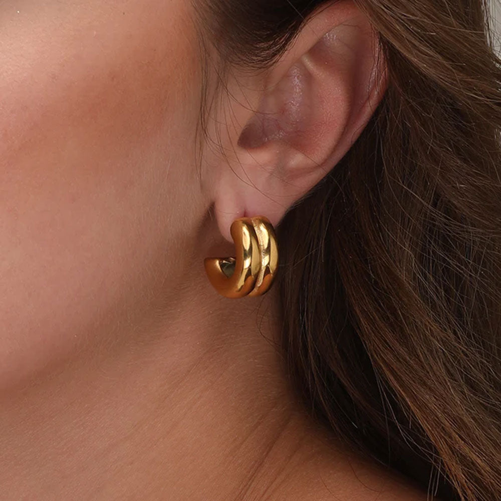 Bold and contemporary, these 18k gold plated plain chunky hoop earrings make a statement with their sleek, polished design. The versatile hoops add a modern edge to any outfit, while the waterproof and anti-tarnish finish ensures long-lasting shine. Perfect for casual chic looks, office sophistication, or evening glamour, these earrings are a must-have statement piece.