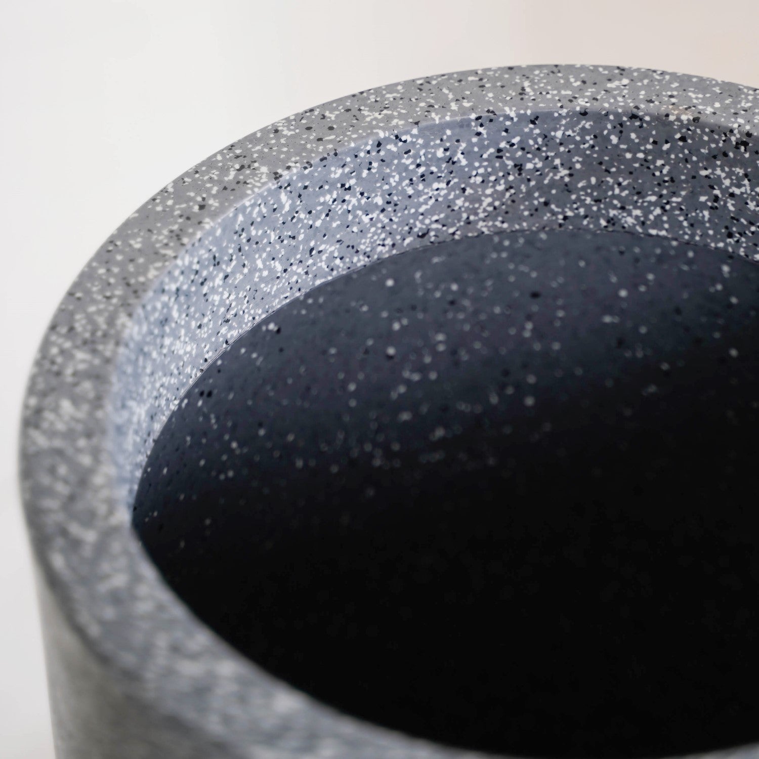 Design: This cylindrical planter boasts a modern and minimalistic aesthetic with a clean vertical profile and rounded edges. Coated in a rich charcoal-grey hue, the surface is enhanced by a fine speckled design that mimics the appearance of natural granite, lending it a sophisticated, earthy charm. The speckles vary subtly in tone, creating visual depth and a dynamic finish. It has a plain outer surface with a cohesive inner texture.