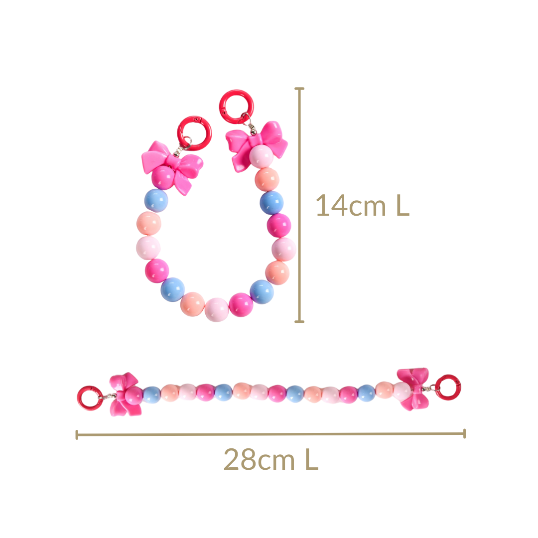 Get ready to fall in love with this cute keychain - it’s a fun, functional little burst of joy! With two sturdy circular lobster clasps, it keeps your keys or accessories secure while adding some serious style points. The vibrant pink, peach, and blue beads are a total mood, and the cute pink bow charms on both sides bring a playful touch.
