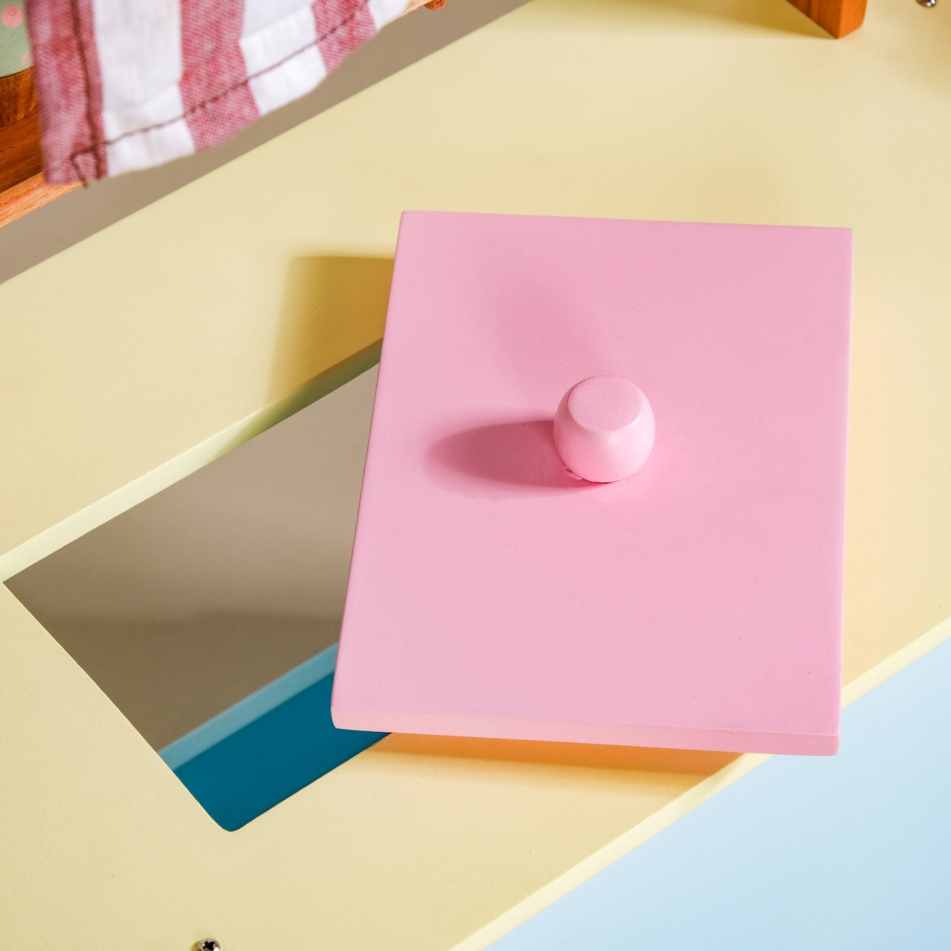 The set includes everything they need for an imaginative ice cream stand, with two wooden ice cream cones, one with a mint cream scoop and pink sprinkles, and the other with a pink scoop and mint green sprinkles, along with two colourful stick lollies in pink and pale yellow. The ice cream top set sits on a wooden serving area atop the cart, perfect for “serving” their sweet creations. A striped cotton curtain in white and purple adds a playful touch, while the yellow stationary wheels create the illusion of a rolling cart. The removable pink lid adds an extra layer of fun, allowing children to “dip” their hands inside and retrieve their ice cream treats.