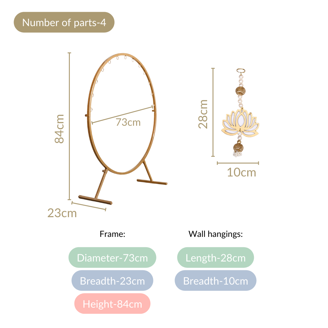 Design: Expertly crafted from rust-resistant iron and adorned with a lustrous gold powder-coated finish, our circular metal backdrop frame exudes enduring charm. Embrace sacred traditions with the included decorative lotus wall hangings, perfect for enriching your spiritual haven.
