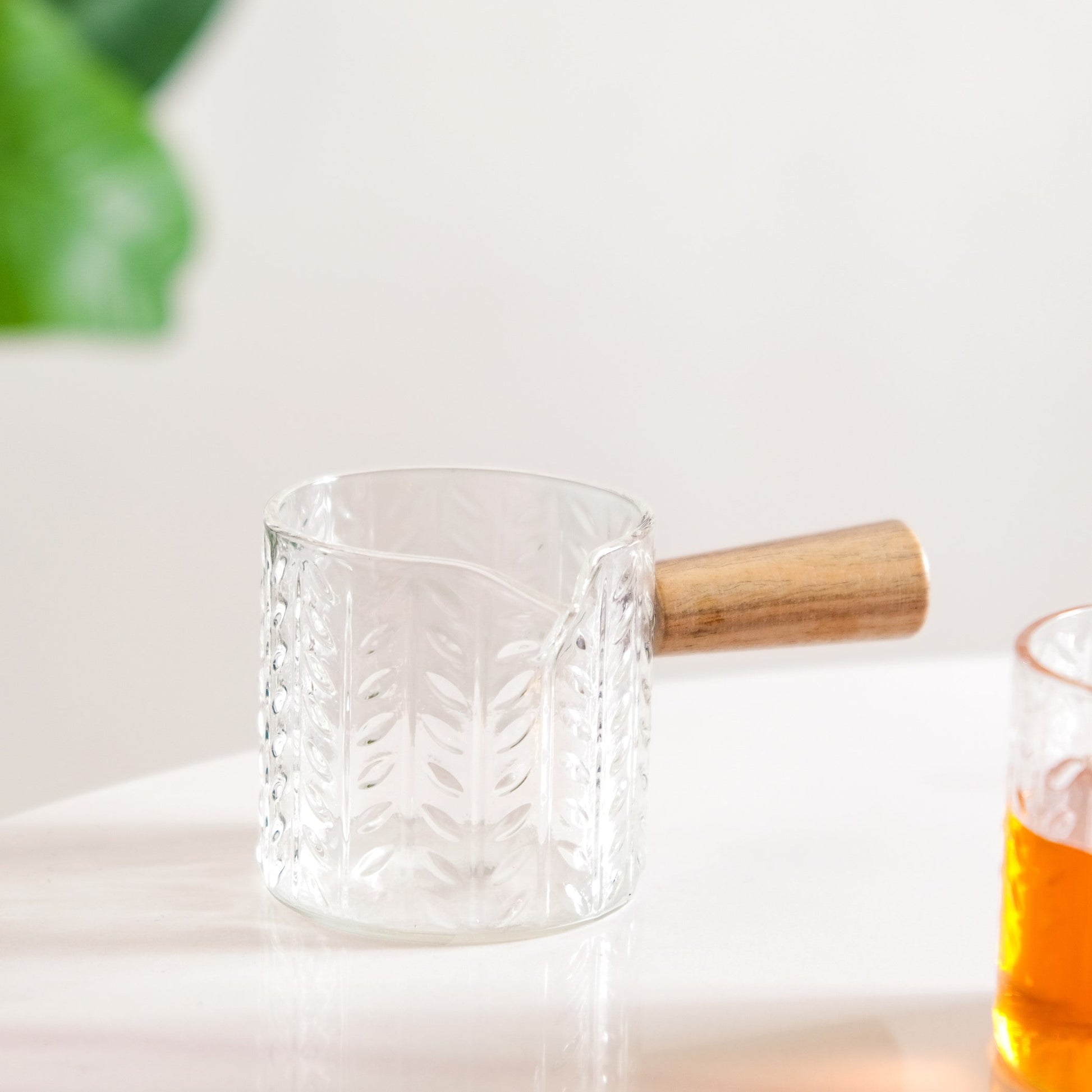 Benefits: This pitcher features a thoughtfully shaped rim that acts as a smooth-flowing spout for easy pouring, minimising drips and splashes, and a wooden handle that provides a secure grip. The embossed glass design adds visual texture and artisan charm, while the thick, high-quality glass resists chipping and beautifully showcases its contents. Perfect for serving sauces, syrups, dressings, or even milk and cream, it brings a touch of elegance to any table setting.
