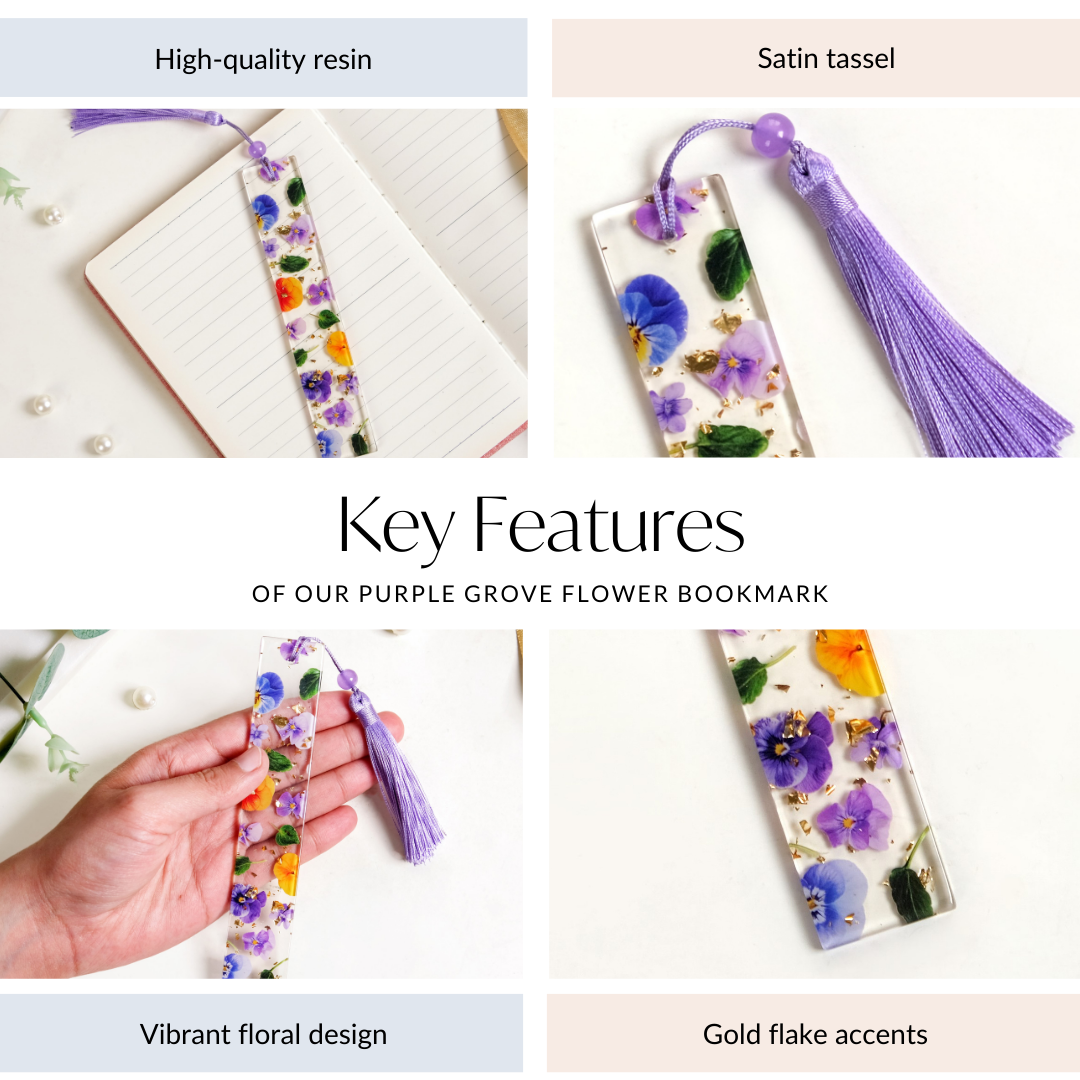 Brighten up your reading moments with this stunning resin bookmark, a delightful blend of art and utility. Handcrafted from resin, this flower bookmark showcases a cheerful array of purple and yellow blooms, accented with delicate gold flakes and lush green leaves, capturing the serene essence of nature's beauty. The addition of this lush, lavender tassel not only gives the page marker a playful twist but also makes it easy to find where you left off in your current read. Perfect for anyone who loves book accessories that combine charm with practicality, this handcrafted bookmark brings a touch of nature to your pages, one chapter at a time.