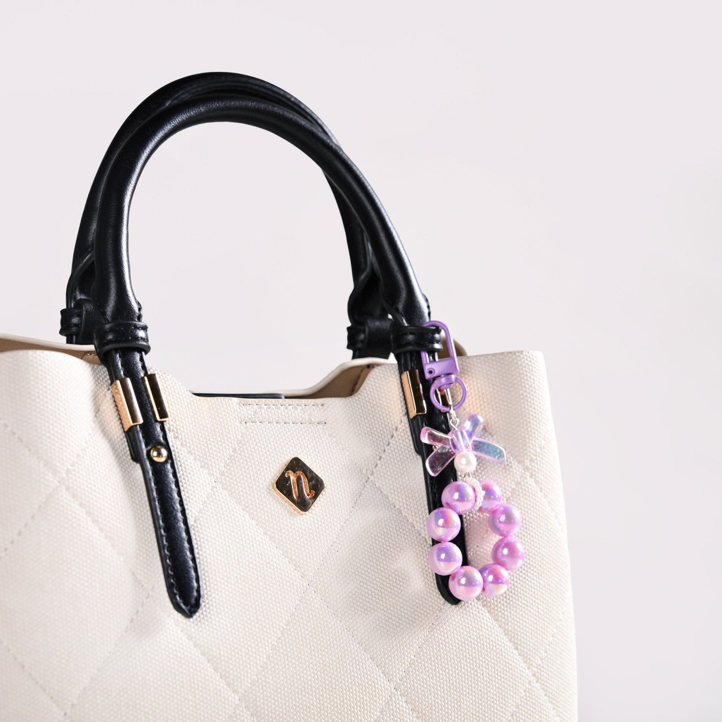 Purple perfection has arrived! With a dazzling iridescent bow charm and a chunky, sparkling beaded hoop, this cute keychain is here to make your day a little more fun. The playful purple hues pop, while the white pearl ring adds a touch of class.