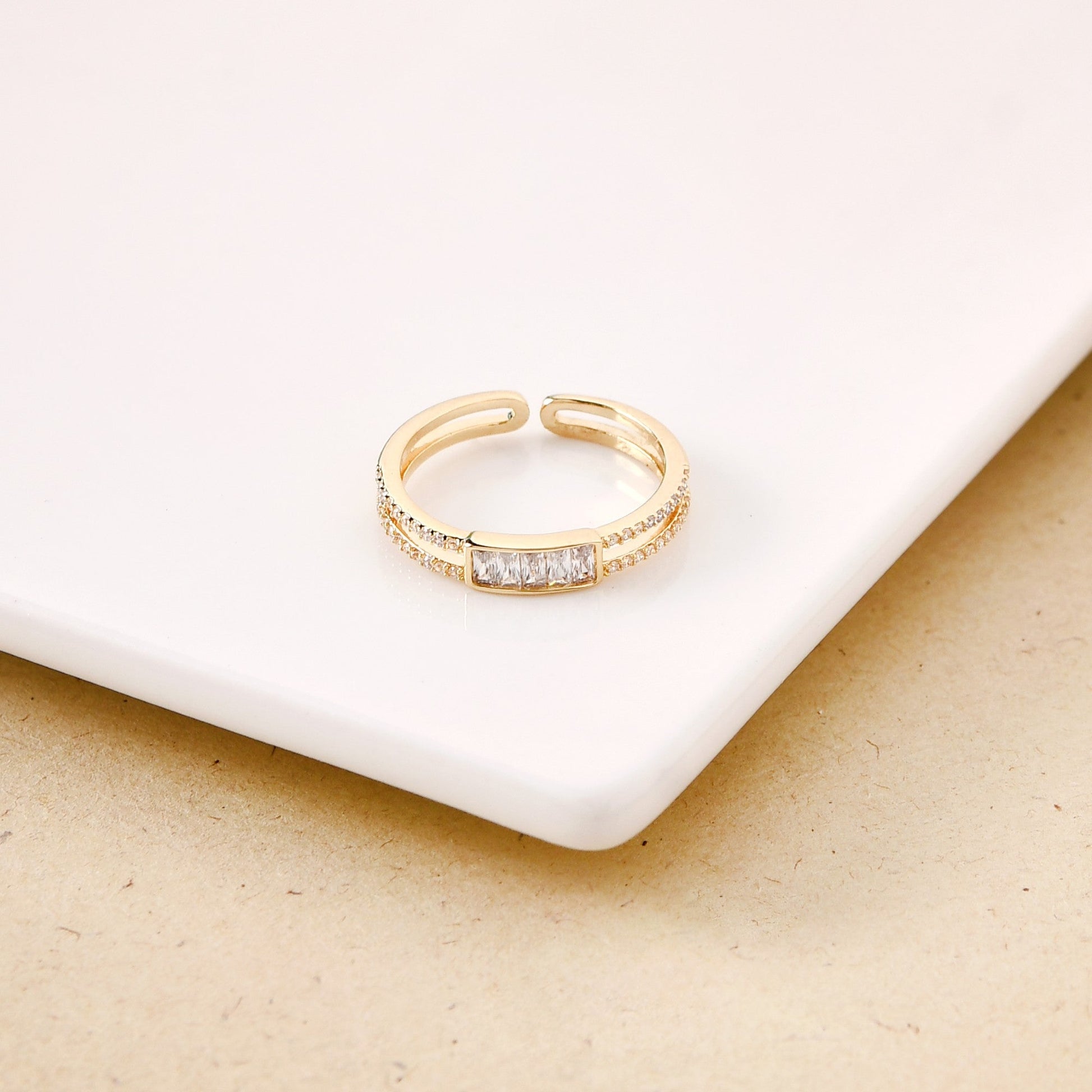 This exquisite gold metal ring features two gracefully separated strands that converge at a central focal point. At the heart of the design lies a rectangular, transparent gemstone, securely bordered in lustrous gold, exuding enduring allure. The front sections of both strands are meticulously adorned with shimmering stones, enhancing the ring's brilliance and charm. This harmonious blend of modern design and classic elements makes it a versatile accessory, perfect for upgrading any attire.