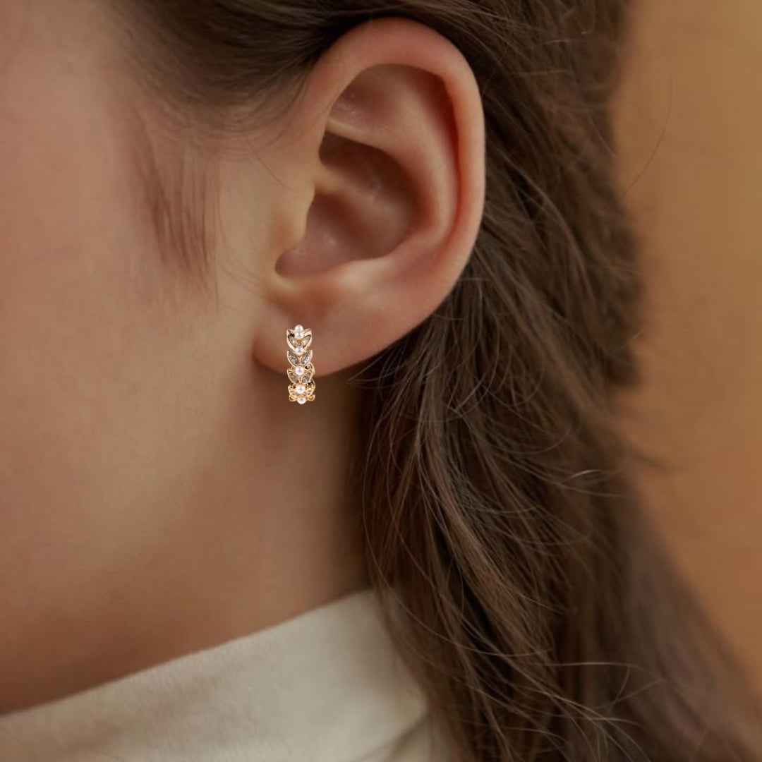 Delicate yet bold, these huggie earrings blend the beauty of pearls with the natural charm of leaves. The gold frame gently hugs the ear, with pearl beads running through the center, exuding a soft, luminous glow. On either side, intricately detailed leaves, studded with sparkling stones and bordered in gold, add a touch of nature’s elegance. It’s not just jewellery; it’s an embrace of nature’s finest elements, creating a sophisticated look that’s both modern and effortlessly graceful.