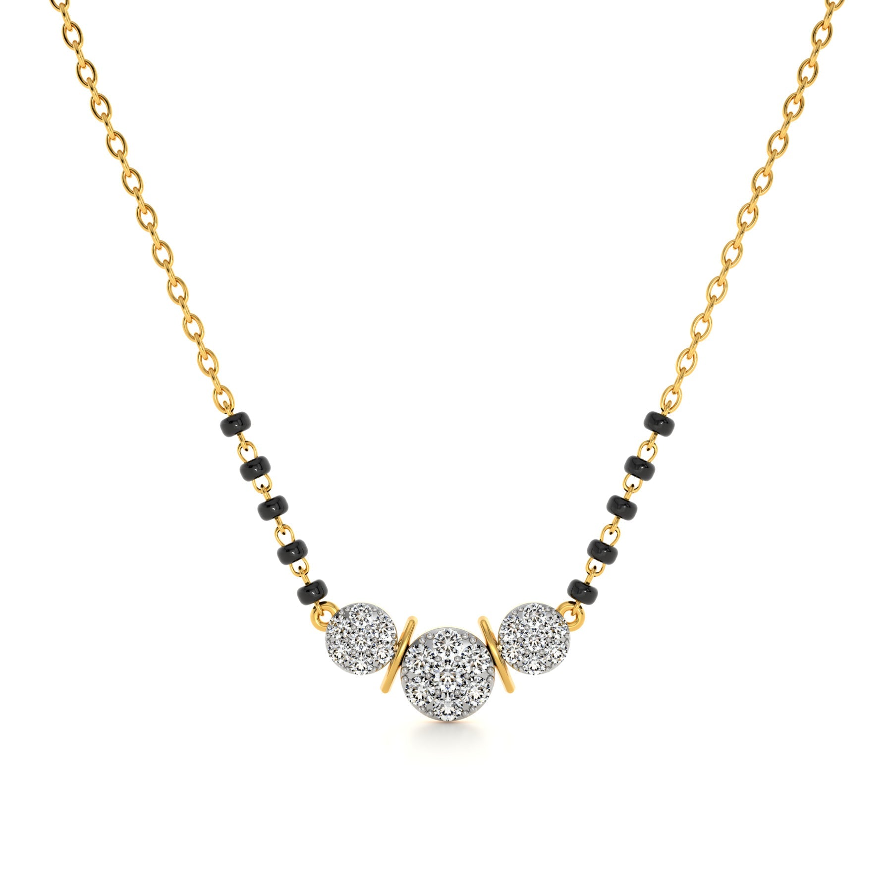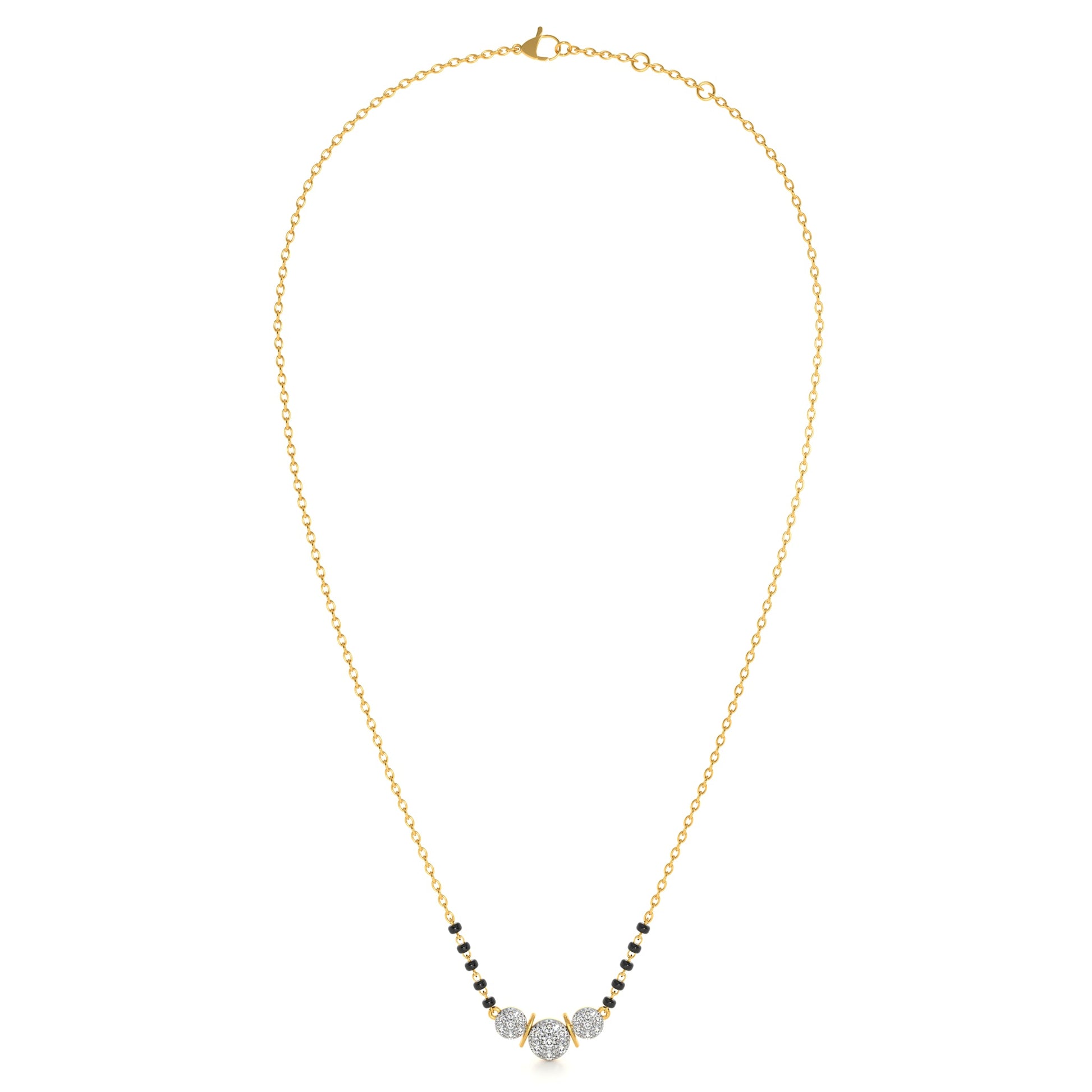 The Radiant Triple Stone Lab Grown Diamond Mangalsutra features three luminous diamonds aligned in perfect harmony, representing strength, unity, and enduring commitment. Each stone radiates brilliance, symbolizing the bond of past, present, and future. Expert craftsmanship ensures maximum sparkle and balance, making this piece both meaningful and elegant. A modern design rooted in traditional symbolism, it stands as a radiant emblem of everlasting love and marital devotion.