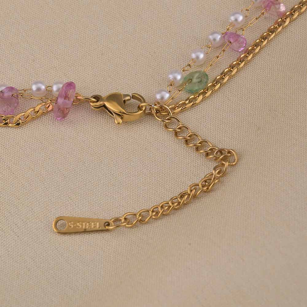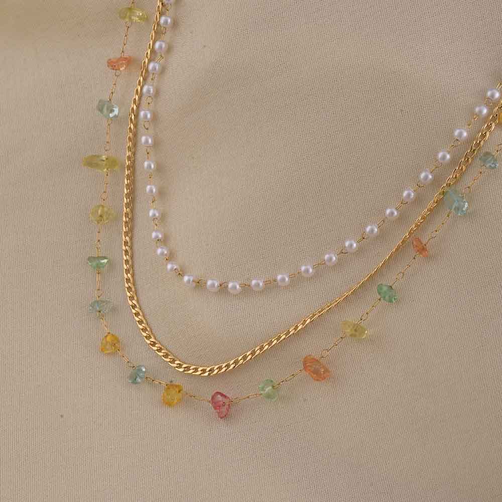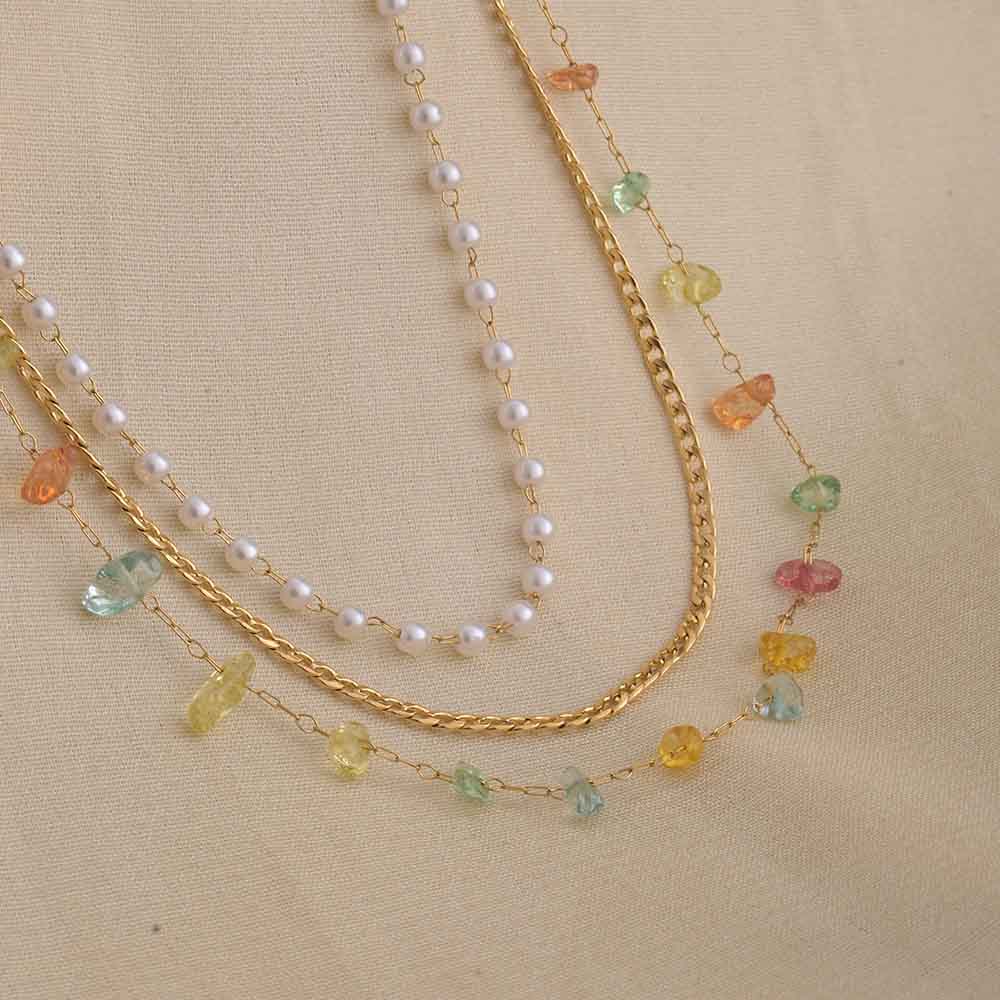 Bright, playful, and fashion-forward, the Rainbow of Gems Layered Necklace brings a cascade of multicolour pearls and synthetic stones to your jewellery collection. Crafted in stainless steel with an 18k gold tone finish, its layered design creates depth and movement, making it a standout statement piece. Perfect for adding a pop of colour and sparkle to both casual and dressy looks.