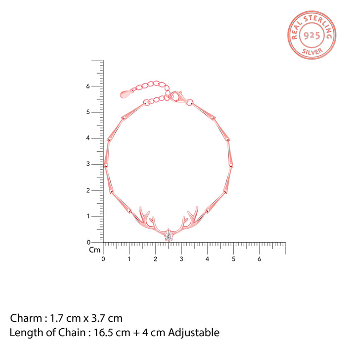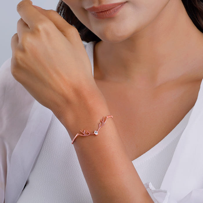 The rose gold bracelet has a design of the antlers of a reindeer with a zircon on the head.