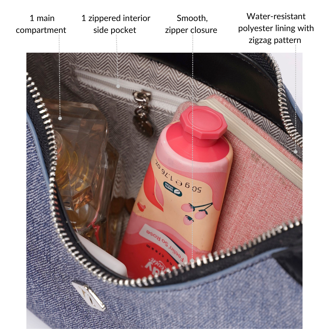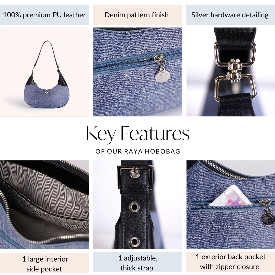 Design: Although made from high-quality PU leather, the Raya hobo bag features a stylish denim pattern finish that gives the bag a contemporary, punk-rock feel that was all the rage back in the 90s. Its adjustable thick strap provides both comfort and flexibility, allowing you to wear it as a casual shoulder bag at all times. The silver hardware detailing adds a touch of modern sophistication, while the water-resistant polyester lining, adorned with a playful zigzag pattern, keeps your essentials secure and protected. The spacious main compartment, complete with a smooth zipper closure, is ideal for carrying all your daily necessities. Inside, you’ll find a large side pocket and a zippered interior pocket for easy organisation, while the exterior back pocket offers quick access to your essentials with a secure zipper closure.