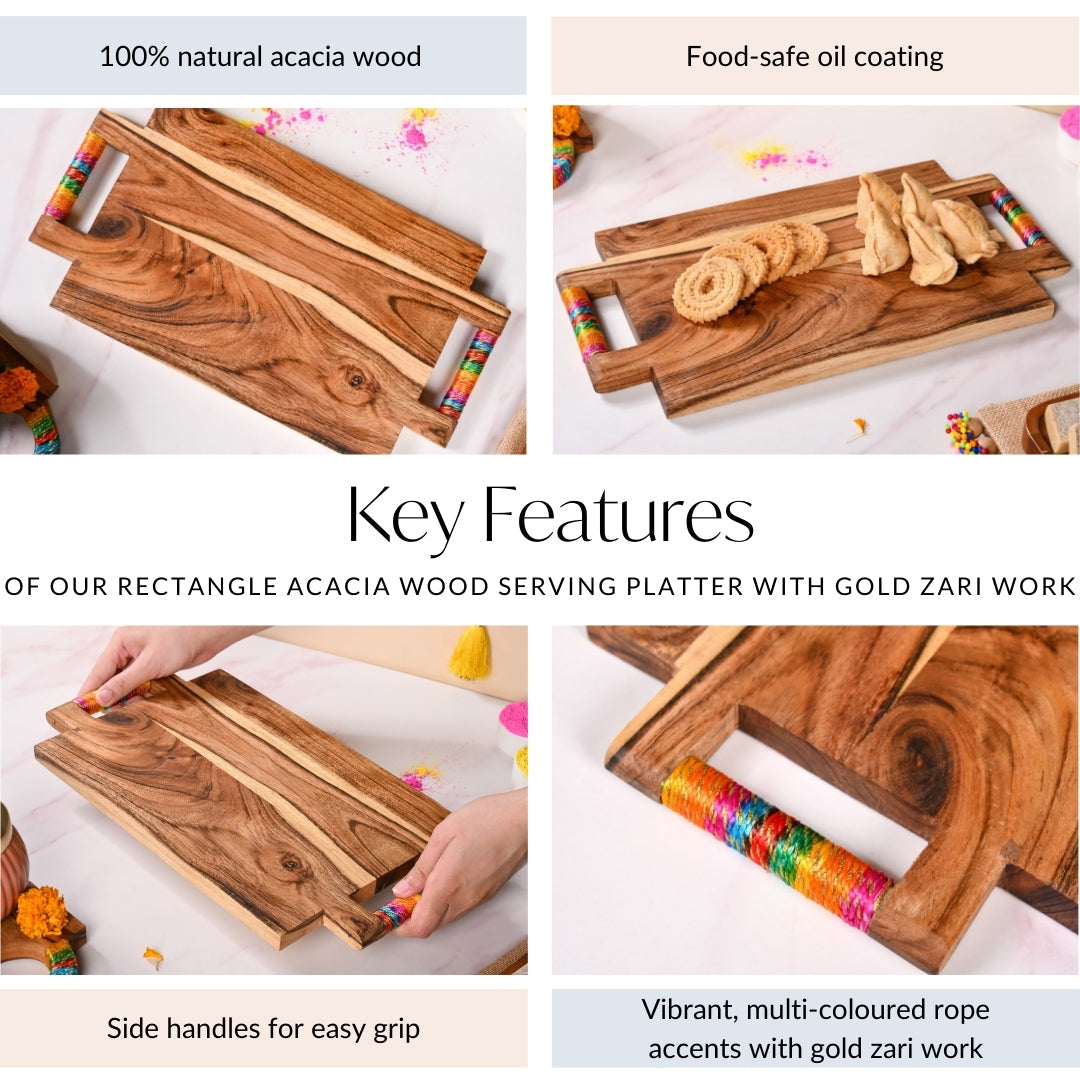 Rectangle Acacia Wood Serving Platter With Gold Zari Work