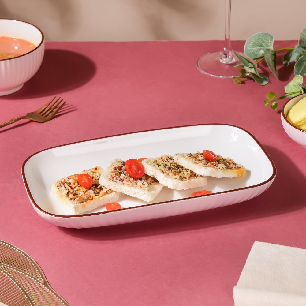 The serving platter in a rectangular shape can be a perfect fit in an ultramodern kitchen setting. The rectangular plate can be used to serve all sorts of dishes - be they continental or local. The long plate can also be used as a cheese platter or dessert plate for serving cakes or sweet bread. The textured long plate is made of ceramic and has a dark brown rim with a polished inner white surface and pastel pink exterior. The product is microwave-friendly, dishwasher-safe, and can be used in an oven as well.