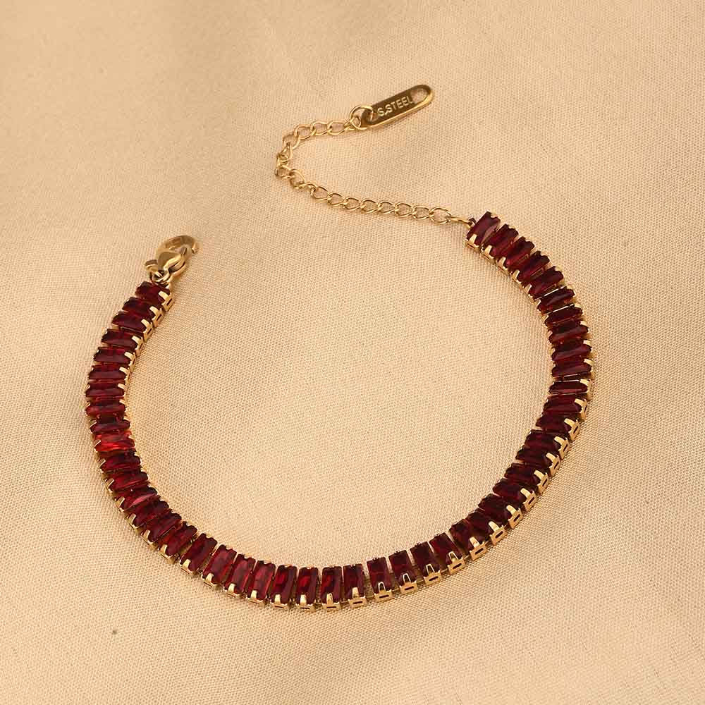 The Red Radiance Statement Bracelet for women radiates bold elegance and contemporary charm. Crafted in 18k gold tone stainless steel, its chain design is adorned with sparkling red cubic zirconia for a vibrant, eye-catching finish. Waterproof and anti-tarnish, this bracelet elevates both casual and evening outfits, making it a versatile statement piece for women who love jewellery that combines color, design, and sophistication.