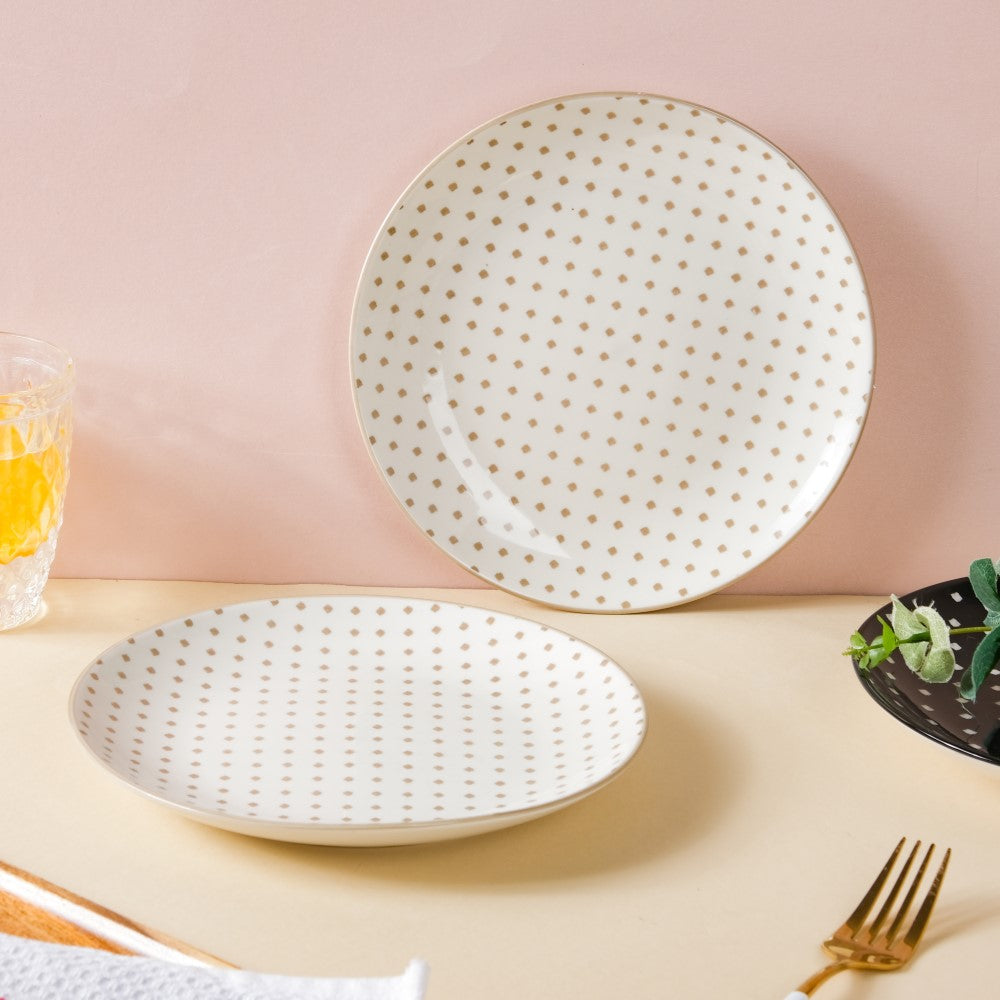 The white ceramic plate set features brown diamond patterns on the top surface, making it stand out from ordinary small appetizers plates. Since the set features 2 snack plates, it can be used as a plate for appetizers to serve at the dinner table during a family gathering. On top of this, the beautiful diamond design of the white ceramic snack plate set also makes it a perfect housewarming gift for new neighbours.
