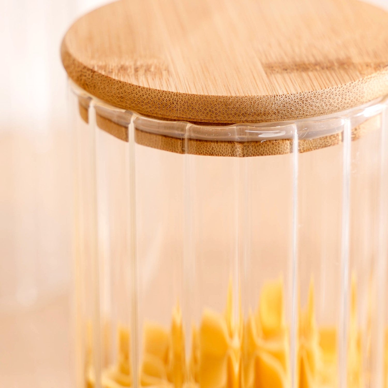 Design: Upgrade your kitchen with our stylish set of four glass storage jars, crafted from high-borosilicate glass for exceptional clarity and durability. These airtight glass jars are non-toxic and lead-free, ensuring safe storage for your pantry essentials. The airtight bamboo wood lids are equipped with a silicone seal that provides a secure, moisture-proof closure, keeping your contents fresh and flavourful. The jars' ribbed textured interior facilitates easy handling and retrieval of stored items.