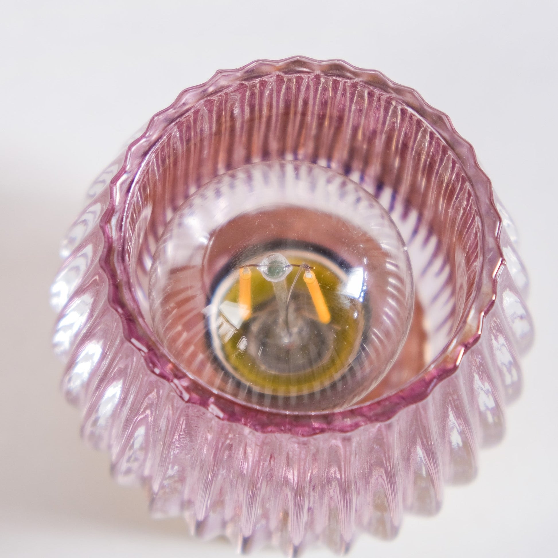 Design: Featuring a tulip-shaped purple-tinted glass with ribbed detailing, the desk lamp’s elegant form adds a touch of charm to any room. The 0.3-watt Edison LED bulb with a tungsten filament casts a warm, ambient glow, creating a cosy atmosphere. Its compact, metal base holds a power button for easy operation and complements the classic yet contemporary design.