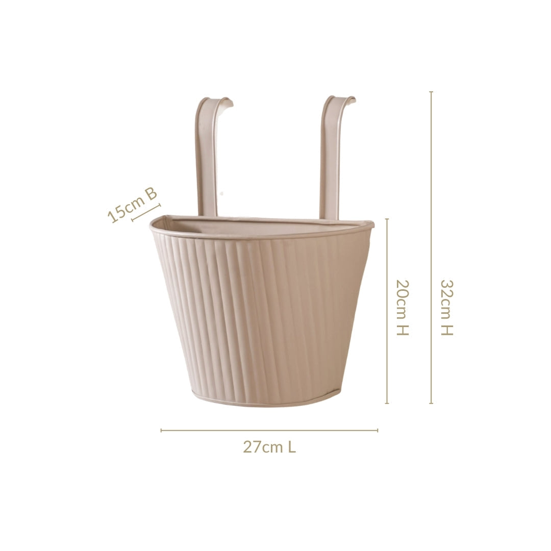 Design: Crafted from durable iron, this wall-mounted planter set features a chic, matte taupe finish. Each metal planter has a clean, vertical ribbed pattern and two securely riveted hanging handles that allow them to be easily balanced on any railing or hook. The smooth interior is seamless, and the pots are conveniently stackable for compact storage when not in use.